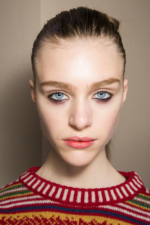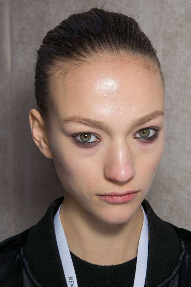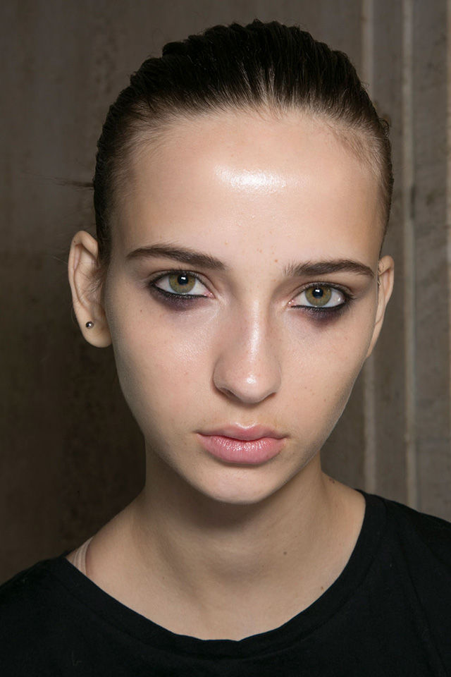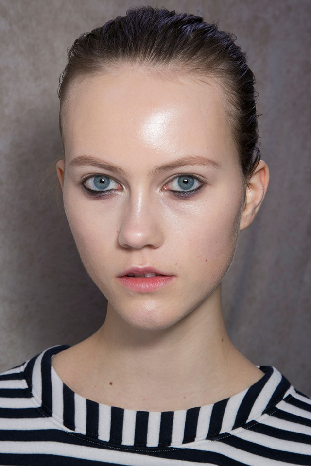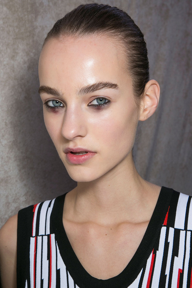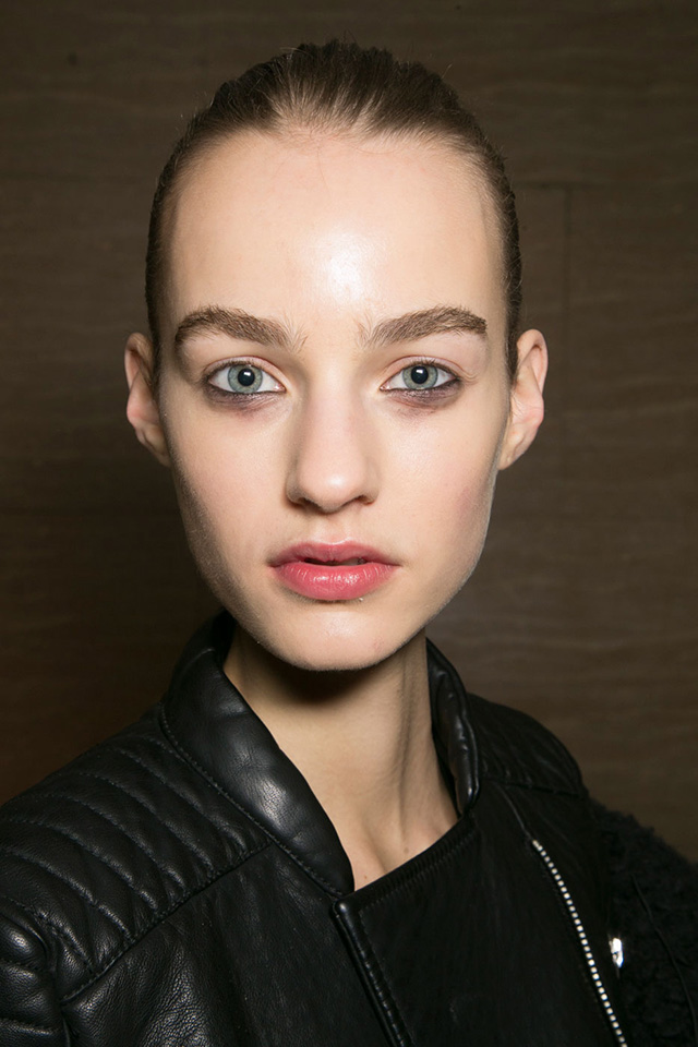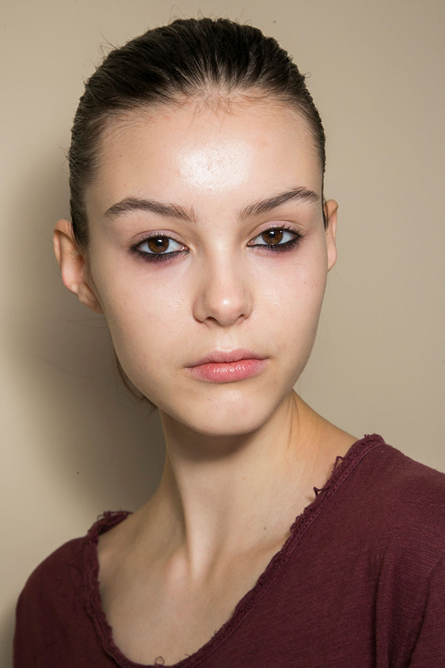 Макияж на показе должен был выглядеть так, будто модели сами нанесли его, причем без использования кистей. Это, конечно, была только иллюзия, ведь за образ на шоу Victoria Beckham отвечала сама Пэт МакГрат. Для начала визажист увлажнила кожу девушек маской SK-II's Facial Treatment Mask, а затем подвела глаза мягким карандашом по внутреннему контуру. После этого Пэт слегка прошлась оттенком по нижнему веку, припорошив его прозрачной пудрой — тем самым визажист создала эффект осыпавшихся теней. «Получилось немного неопрятно, но в этом есть свой шик. Она настоящая горожанка», — описывает результат визажист.