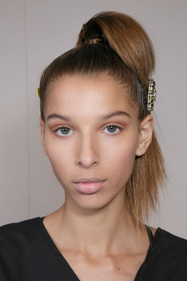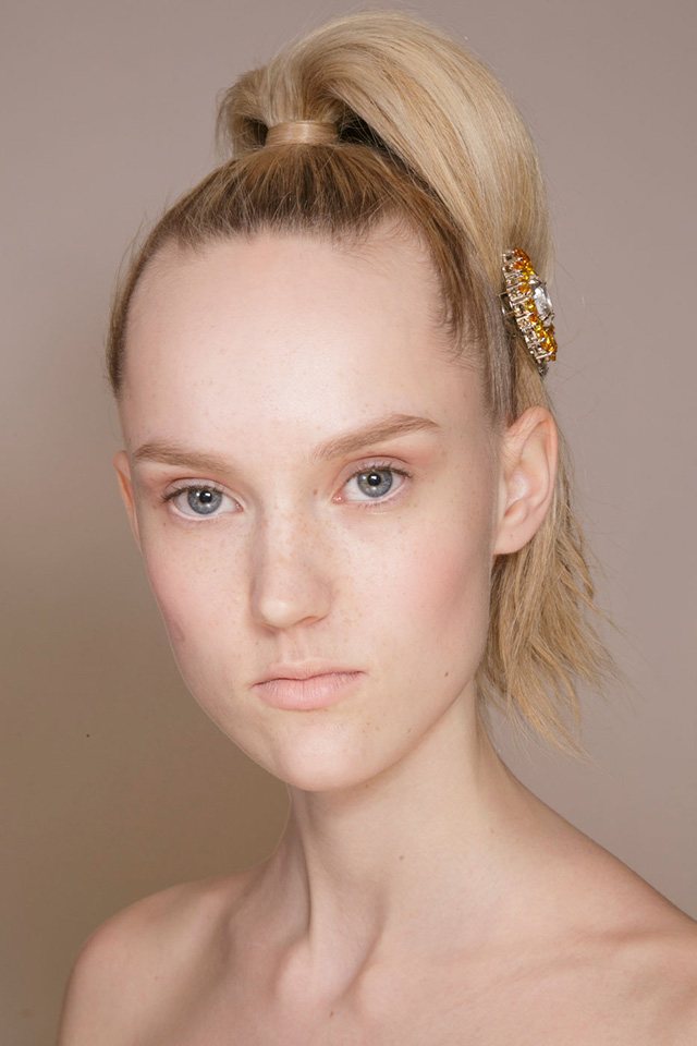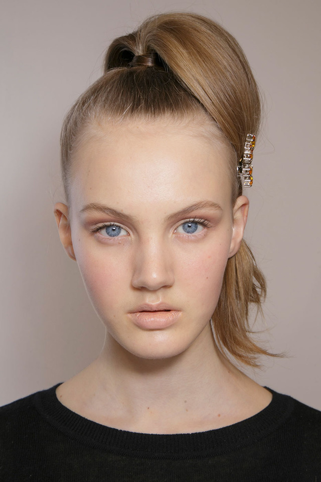 Для женского показа Prada любимый стилист Миуччи Гвидо Палау решил повторить необычный пучок, придуманный им в январе для мужского шоу. Женская версия выглядела не менее артистично, а разноцветные заколки-броши и воздушная текстура сделали прическу по-девичьи нежной. Для этого образа Гвидо собрал волосы в гладкий высокий хвост справа, а затем перекинул каскад пушистых прядей на противоположную сторону, закрепив их одной массивной заколкой. Чтобы добиться нужной текстуры, он нанес моделям мусс Redken Stay High 18, прежде чем высушить волосы, а готовую прическу закрепил лаком Redken Super Force 12.