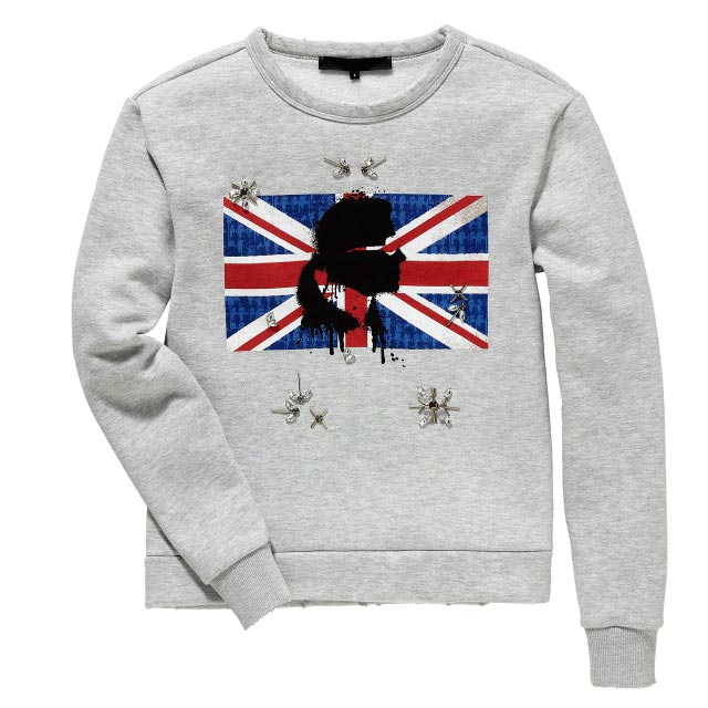 С чем ассоциируется в первую очередь Британия? Самый узнаваемый в мире флаг Union Jack, английская королева и, пожалуй, музыканты — примерно так выгляди тсписок основным ассоциаций. Британский флаг Карл Лагерфельд и спользует в принтах на толстовках и как схему для узора на клатчах, вместо изображения королевы использует свой собственный портрет в профиль, ну а британским рок-н-ролльным духом проникнута вся небольшая коллекция.