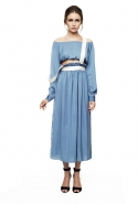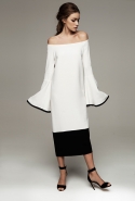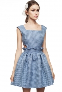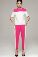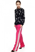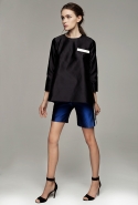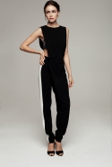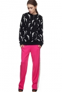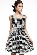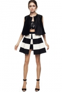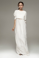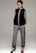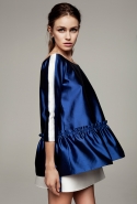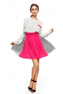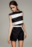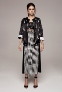 Настроение — спортивно-романтическое: у платья со спущенными плечами свободный, комфортный силуэт, к длинной юбке со складками пришиты широкие белые подтяжки, а укороченные брюки с лампасами можно носить как в офис, так и на вечеринку. Юбку, топ и жакет-бомбер Юля разрисовала крошечными револьверами, несколько платьев расчертила в мелкую черно-белую клетку, а по бокам рукавов на блузках провела полоски контрастного белого цвета.