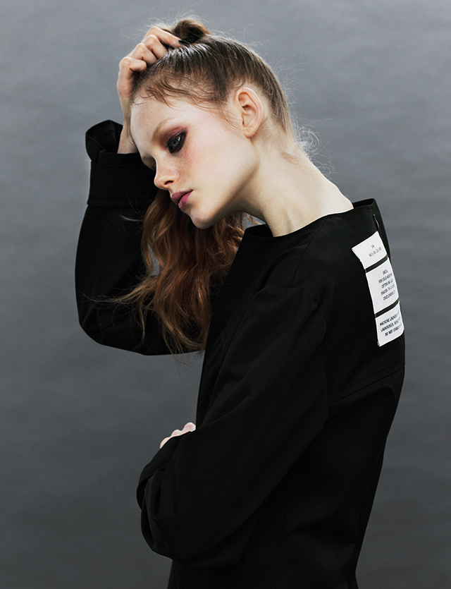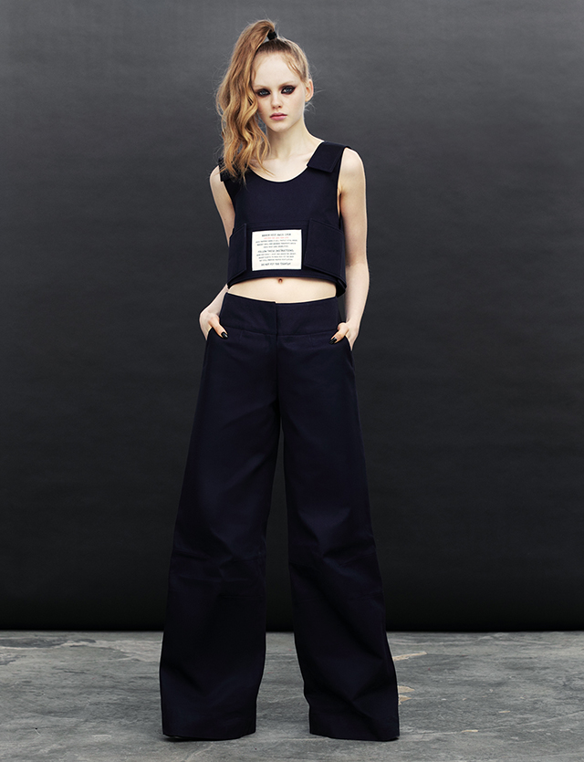 Главную роль на этот раз играют не спортивные мотивы, а идея униформы. Даша Сельянова предлагает вспомнить о рабочей одежде: объемных куртках и пиджаках с чужого плеча, широких, словно не по размеру, брюках с грубыми заплатами на коленях. А кое-где главными элементами оказываются большие белые нашивки, напоминающие этикетки, по ошибке пришитые не внутрь, на изнанку, а на лицевую часть вещи. Даже юбки выглядят так, словно переделаны из старой форменной одежды: бедность и юность, часто тождественные, всегда были хитры на выдумки.