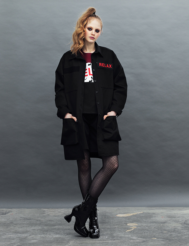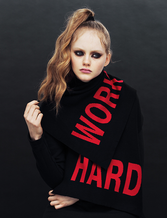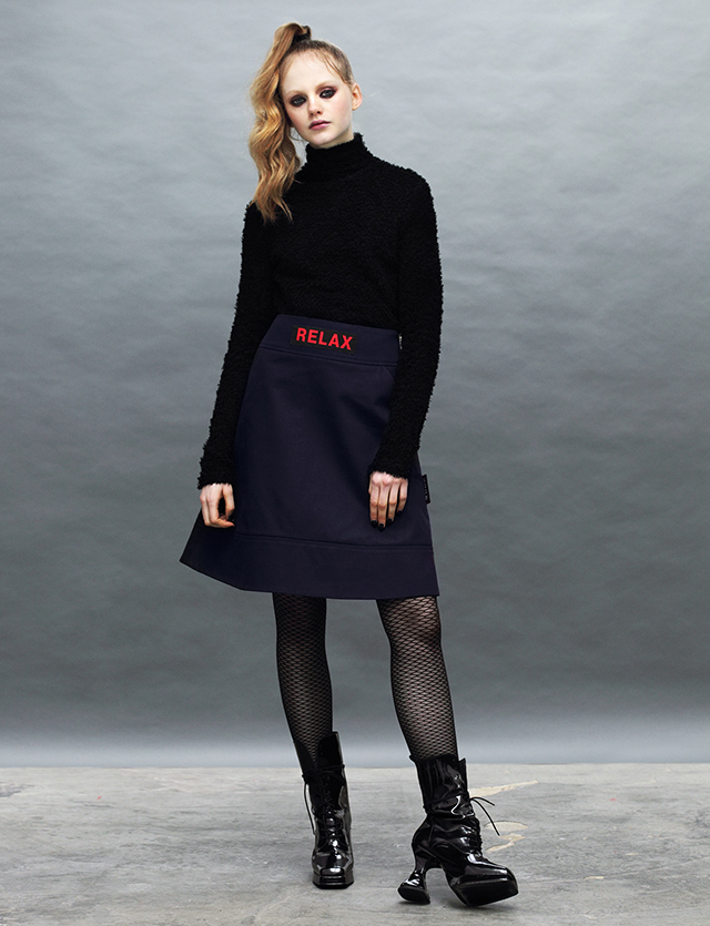 Осенне-зимнюю коллекцию Даша Сельянова, основательница ZDDZ, назвала RELAX — под этим приятным лозунгом команда марки и предлагает провести следующий сезон. Поэтому ярких красок на этот раз куда меньше: вместо розового, желтого и почти кислотного синего ставки делаются на черный, серый и хаки. Вечным акцентом остается красный — «кровавые» лозунги Work Hard, Do Not, Denial и Relax, похожие на электронные бегущие строки, смотрятся особенно эффектно.
