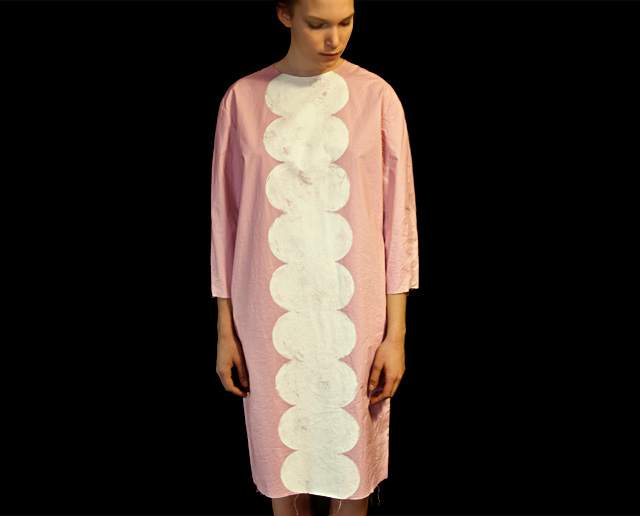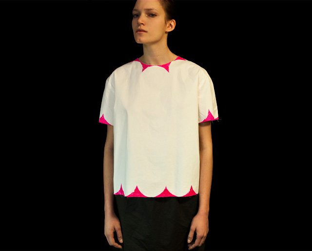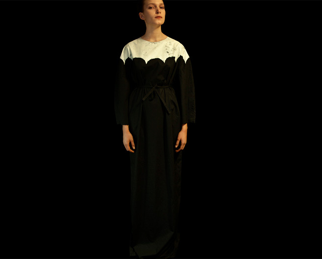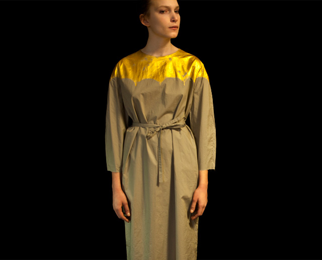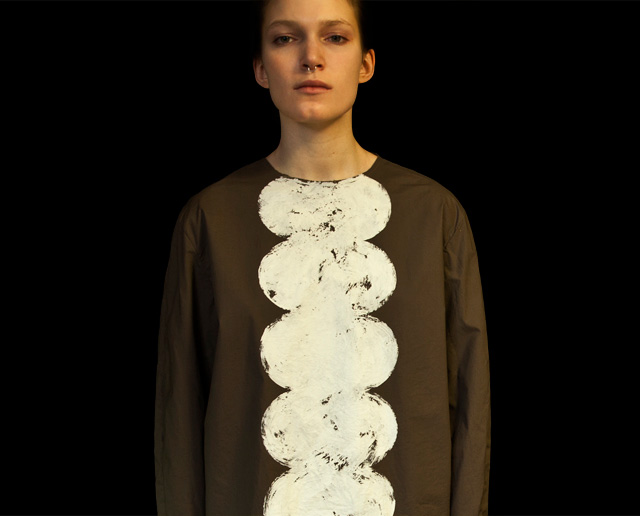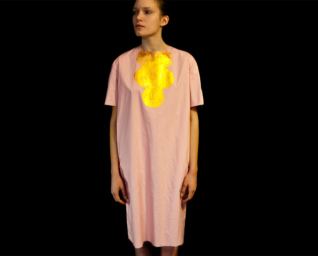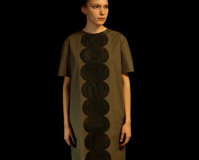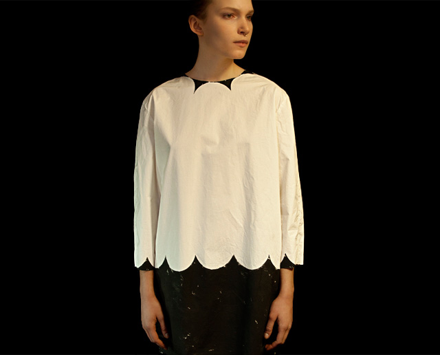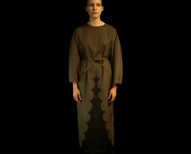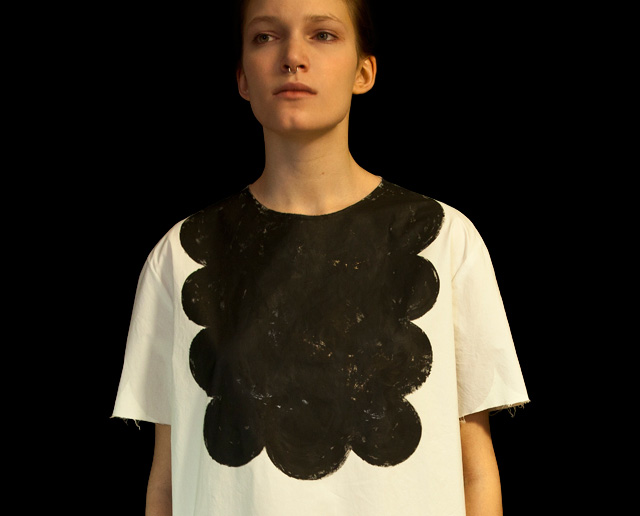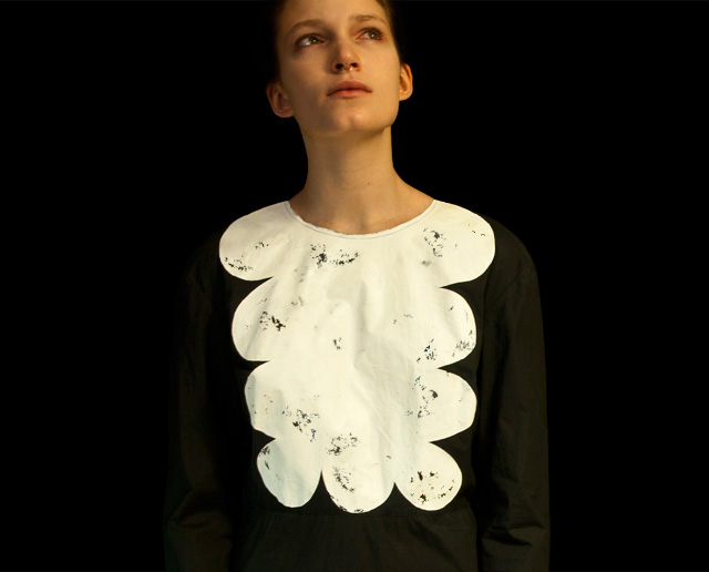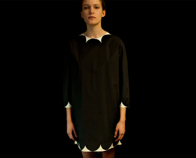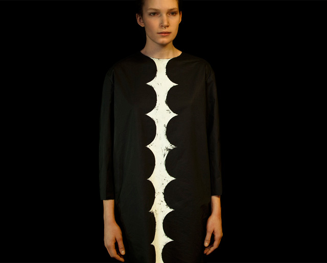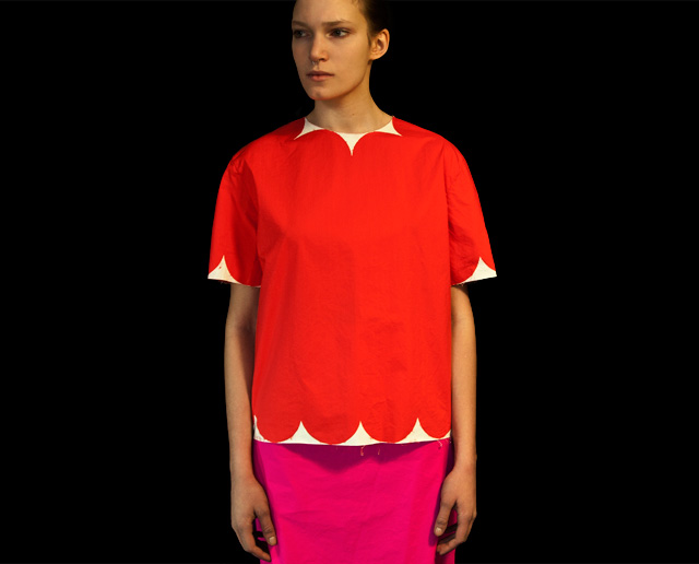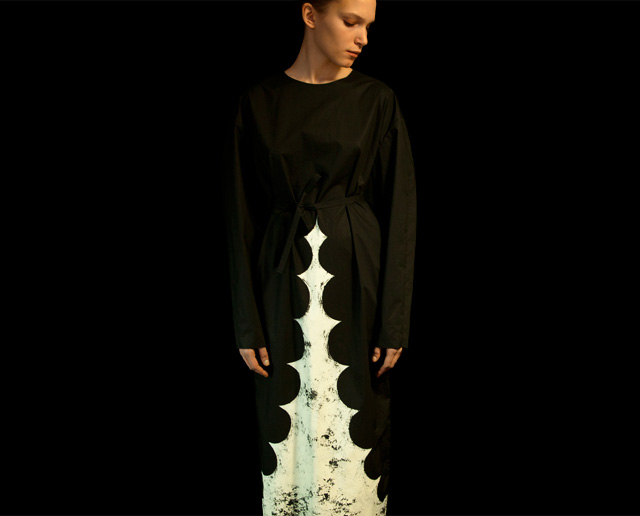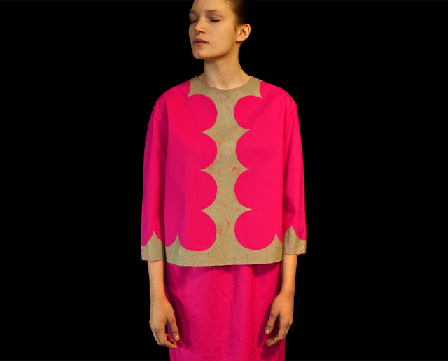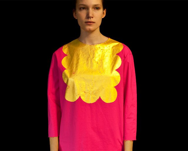 Живопись XV — XVII веков, арочная архитектура, акведуки, яркие рисунки на тканях финской компании Marimekko, «Алиса в Стране чудес», мультфильм «Кот в сапогах» 1968 года, детские игрушки, Дэвид Боуи и Chemical Brothers — таков примерный список источников вдохновения для новой коллекции, представленной Ниной и Донисом. А кто сказал, что будет легко? Разглядеть следы всех этих тем в вещах, в принципе, абсолютно традиционного для Nina Donis кроя и будто созданных с использованием тех же приемов, точно будет непросто — эта задачка сравнима с журнальной головоломкой повышенного уровня сложности. Представим, что арочная архитектура и акведуки — это каемка из полукружьев, к ним же (и к ярким, почти неоновым краскам) можно приписать и Marimekko, а старинную живопись поищем в неровно наложенной плотной краске, холщовой текстуре, торчащим по краям ниточкам и портретной технике того времени. Последней нашей теорией станет то, что отсылки к Дэвиду Боуи прячутся где-то в районе золотой манишки на одном из платьев — остальные загадки попробуйте разгадать сами. Лучшей подсказкой станет мудборд, присланный самими дизайнерами.