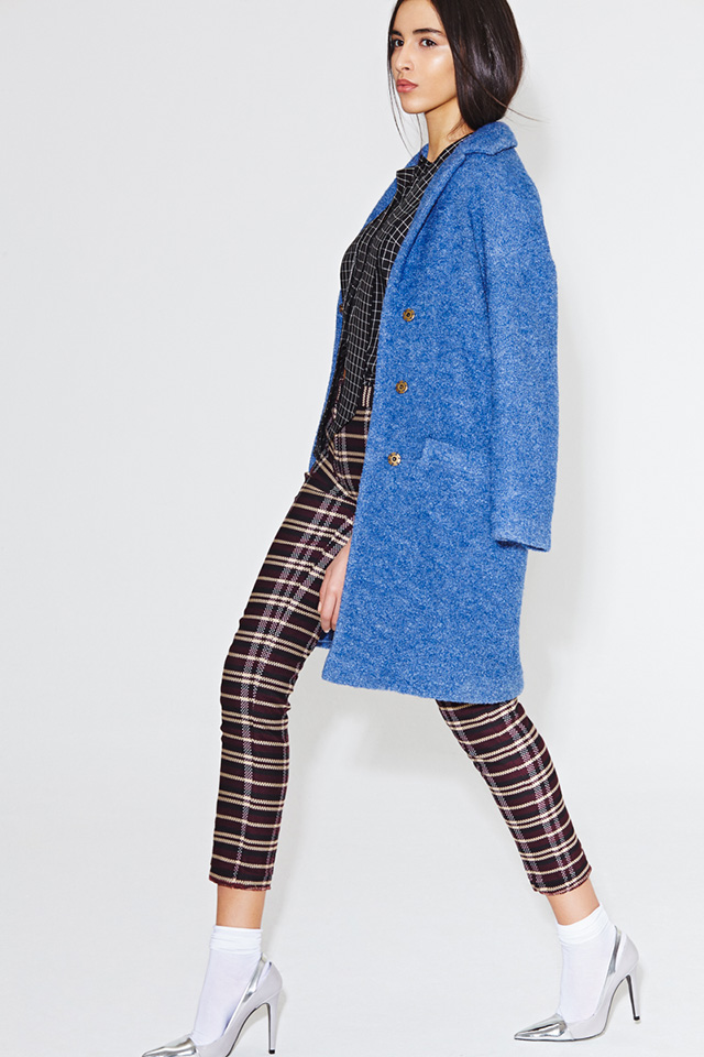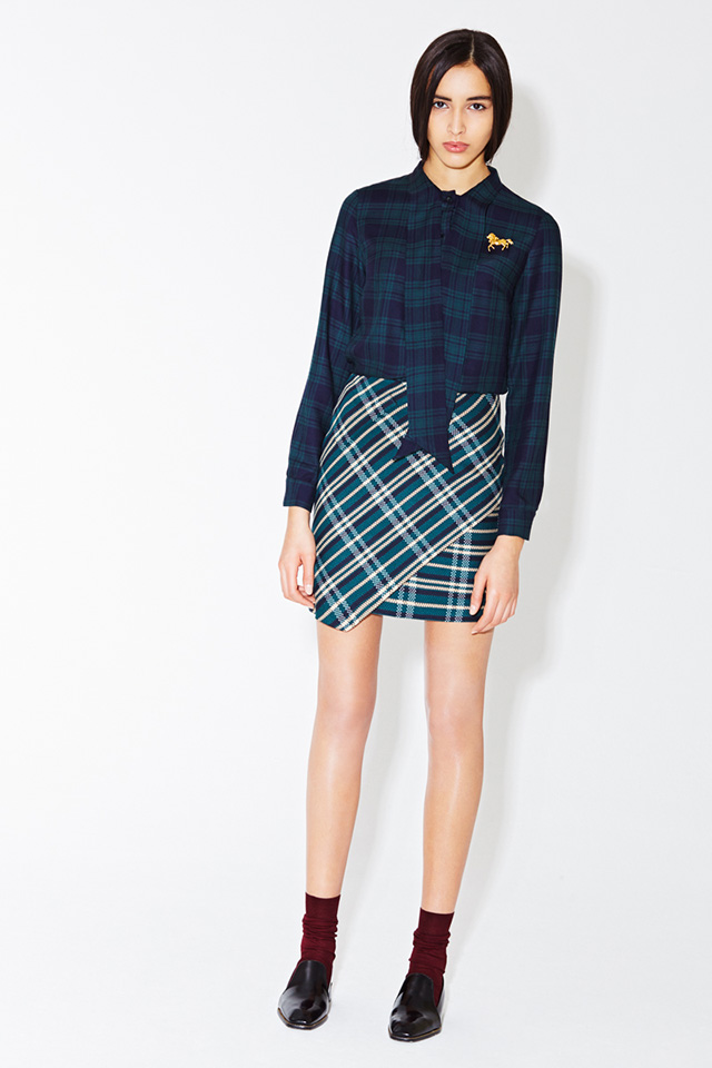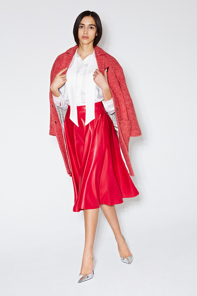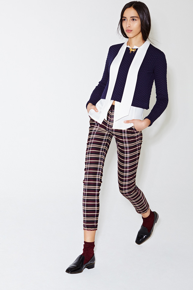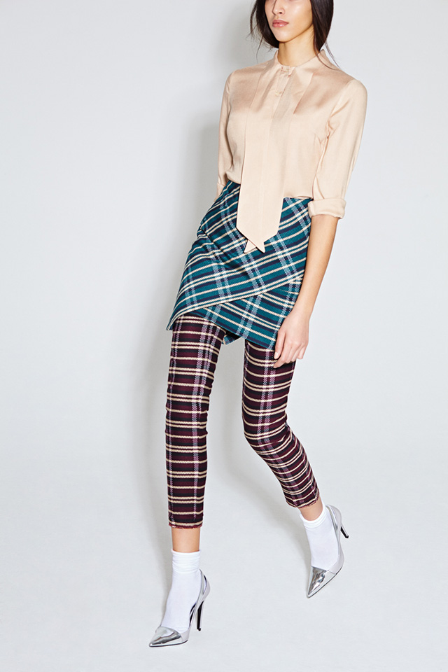 Главными цветами этой весны для Даши стали бордовый, алый, глубокий зеленый и синий, главным рисунком — необычная, чуть вытянутая клетка. Из этой ткани сделаны узкие укороченные брюки и геометричные юбки, которые дизайнер предлагает носить как по отдельности, так и вместе.