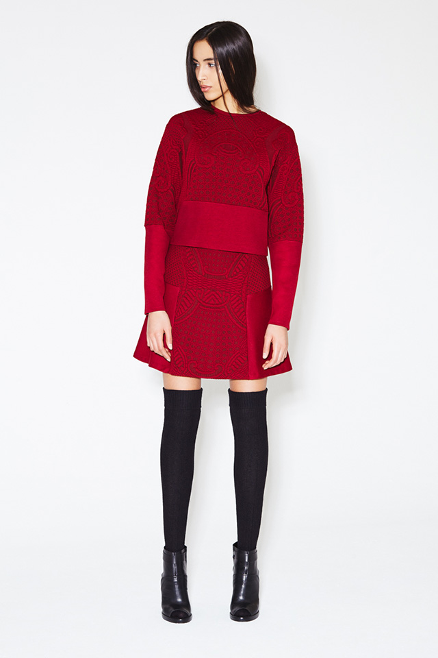 Но нам больше всего нравятся все-таки яркие трикотажные комплекты с фактурным узором. В этот раз рисунок на свитшотах и юбках напоминает лепнину на зданиях готических соборов Парижа.