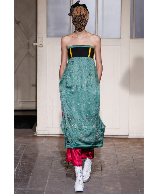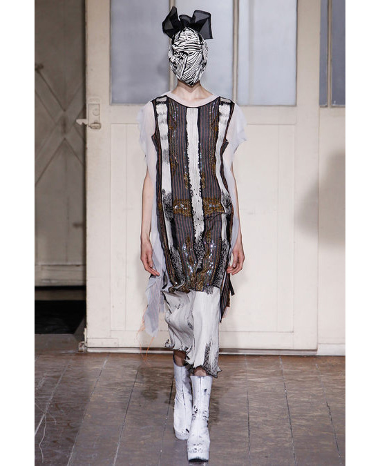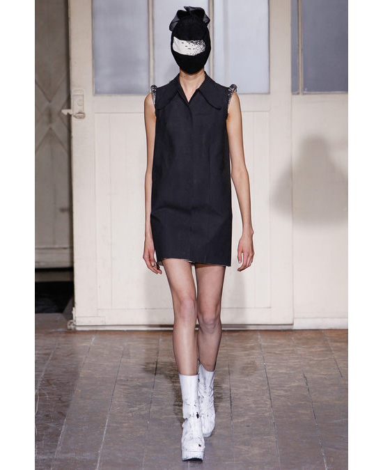 Тема переработанных вещей-гибридов, "собранных" из разных предметов одежды, псевдоантикварных и современных, очень актуальна для последних коллекций дома. Как и тема "экологической моды" — она нашла свое удачное продолжение в трех последних моделях: два платьях с двуцветным геометричным рисунком и серебряная "шубка" из блестящего мохнатого материала оказались сделанными из кусочков фольги, вшитых в основу из шелка. Чего, собственно, мы ждем от показов Maison Martin Margiela? Маленькую коллекцию — на этот раз она состояла всего из 19 моделей, — которая представит в неожиданном ракурсе уже известные (а порой и надоевшие) нам темы, удивит нас своей проницательностью и юмором и даст богатую пищу для размышлений.