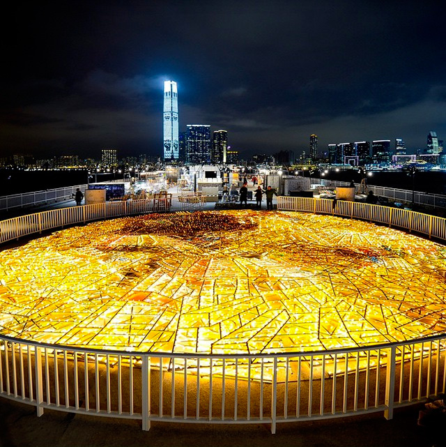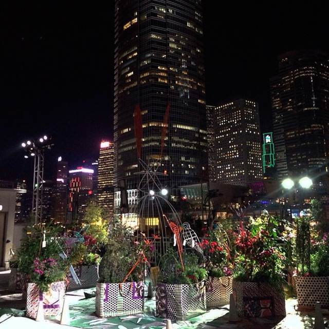 Тут на самом деле было чем восхититься: световая инсталляция Массимо Бартолини, о которой мы писали в анонсе мероприятия, получилась действительно завораживающей — арт-объект напоминал вид ночного города из окна иллюминатора, а поскольку раскинулось это чудо на крыше, то вечерние огни Гонконга только поддерживали такое впечатление.