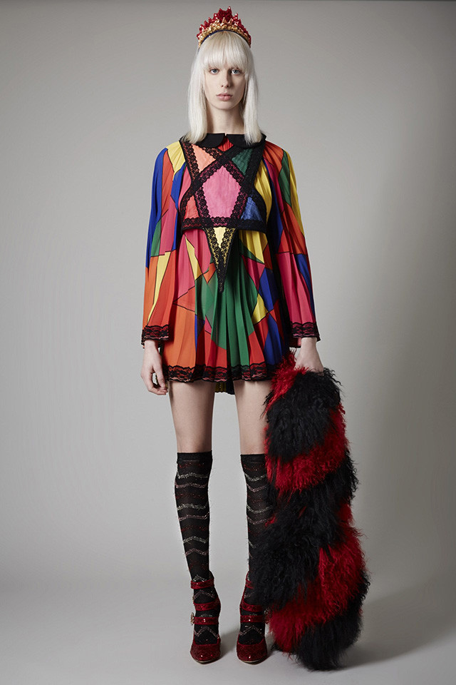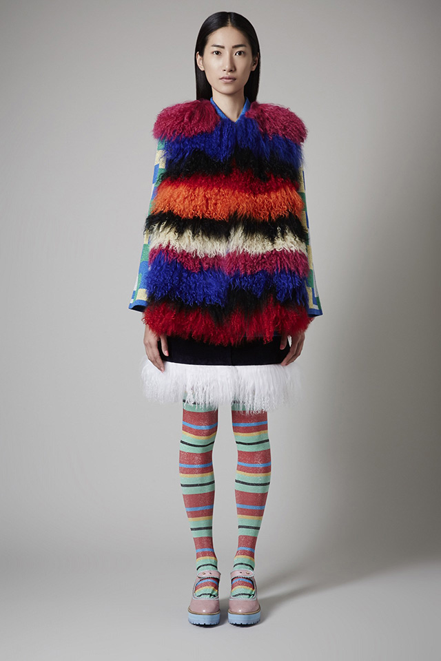 Коллекция радует глаз своей непосредственностью, жизнерадостностью и игривостью (в хорошем смысле этого слова). Яркие оттенки, обилие рюшей, кружева и узоров, градиенты на ворсе меховых жилетов, геометрические принты на свитерах и колготках — скучать не придется. На блузах, заколках и кошельках появились вишни — символы воображаемой девичьей музыкальной группы The Cherries, для которой Meadham Kirchhoff и шили этот гардероб.
