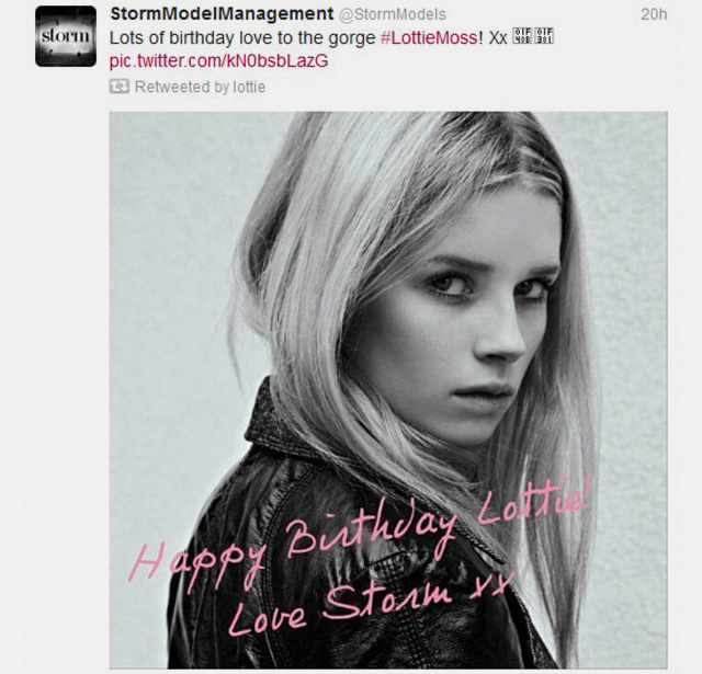 Младшая сестра Кейт Мосс, Шарлотта, которую и в семье, и в модном мире знают как Лотти, подписала свой первый модельный контракт — с агентством Storm, скаут которого когда-то встретил в аэропорту саму Кейт и открыл ее для модельного мира. Кейт на тот момент было 14 лет, а на Лотти агентство обратило внимание на свадьбе старшей сестры в июле 2011, когда ей было всего 13. Тогда мама Шарлотты и представители Storm решили, что девочка еще слишком мала для модельной работы. Но 8 января, в свой шестнадцатый день рождения, младшая сестра Кейт с подписью "Wot u sayin" выложила в твиттере свою первую фотосессию для агентства.