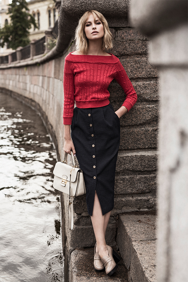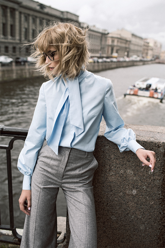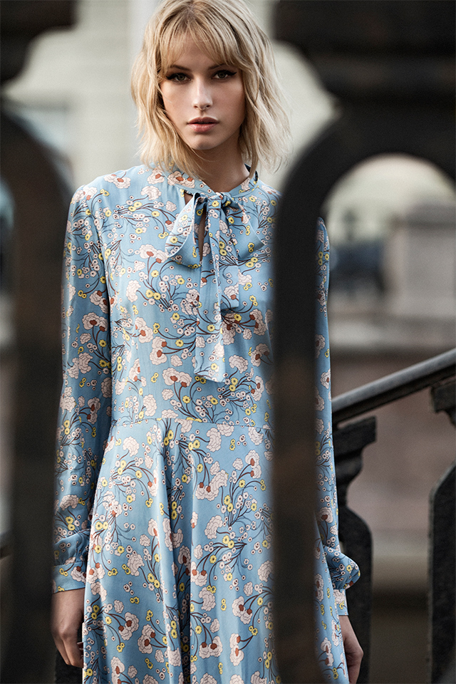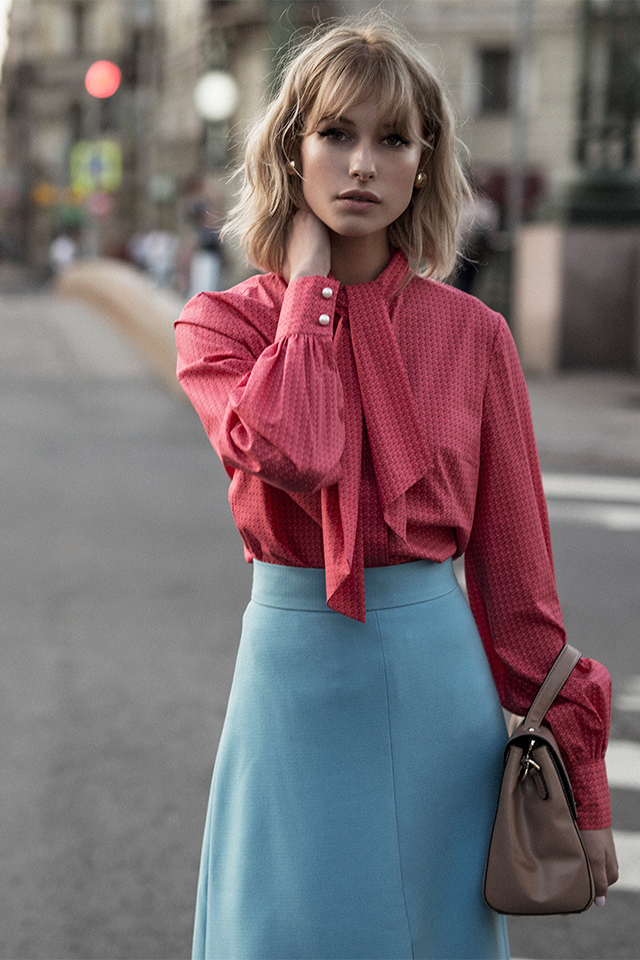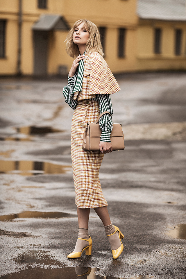 Возвращаясь к формам: в коллекции не найти никаких спортивных или оверсайз-вещей, только предельно женственные фасоны вроде платьев-футляров, блузок с бантом, приталенных двубортных пальто, кейпов и юбок до колен.