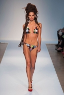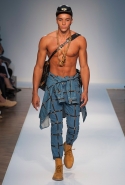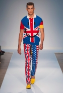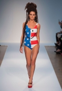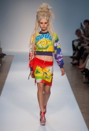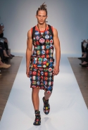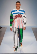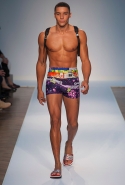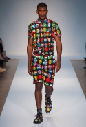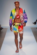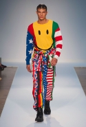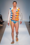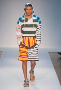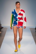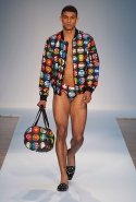 В ком в ком, а в Джереми Скотте мы точно были уверены: за что он ни берется, будь то Moschino или Jeremy Scott (разница в глаза больше не бросается), это окажется все тот же веселый трэш. Усыпающие все подряд, от курток до плавок и сумок, улыбающиеся рожицы с разрисованными под флаги лицами (будем считать это приветом футбольным болельщикам к Чемпионату мира в Бразилии) выглядят почти шизофренично, а те же улыбки уже с лаковых лоферов вконец пугают. На их фоне даже сетчатые комбинезоны и шлепки с золочеными лого Moschino выглядят уже почти буднично — Бог с вами, в России сетчатой майкой никого не удивишь.