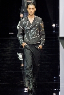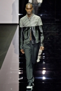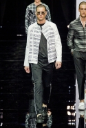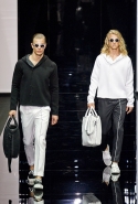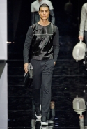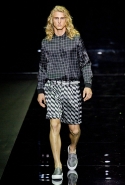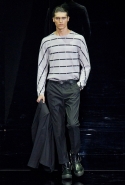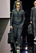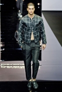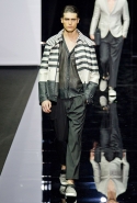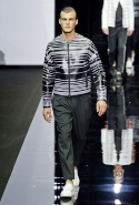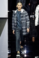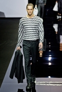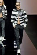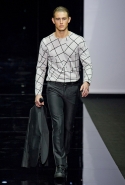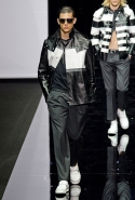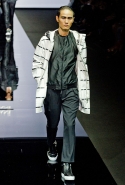 Крупная оптическая клетка, черная на белом и белая на черном, полоски разной ширины во всех возможных сочетаниях — геометрия и привычная монохромная графика в коллекции Emporio Armani оживают прямо на его моделях. Расстегнутая снизу до самой груди молния на куртке разводит полосы, превращая их в разомкнутые круги, простые прямые путаются, переплетаются и распадаются на кусочки. Похожее происходит, например, с ложкой, опущенной в стакан воды, которую граница между водой и воздухом в наших глазах "разрезает" на несколько частей.