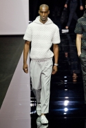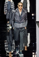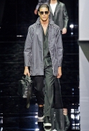 От резких переходов начинает рябить в глазах, но их Джорджо Армани уравновешивает крупными блоками черного и темно-синего без примесей, на которых глаз буквально отдыхает. Но уже через десяток-другой выходов (а это, учитывая размах, с которым команда Emporio Armani подошла к выпуску коллекции, совсем немного — шутка ли, 90 выходов!) клетка возвращается в сочетании с новым повторяющимся принтом, только еще мельче, а полоски становятся тоньше и чаще.