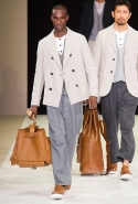 Когда всю историю собственного модного дома написал сам, практически от руки, вовсе не обязательно копаться в архивах в поисках вдохновения — достаточно просмотреть собственные фото N-й давности. А чтобы сделать коллекцию универсальной, подходящей каждому мужчине, а не только ее создателю, не нужно зацикливаться на каком-то одном силуэте или даже принте. Поэтому цветовая гамма весенней коллекции Giorgio Armani максимально нейтральна и почти не отклоняется от выбранного пыльно-дорожного направления. Нарушает идиллию неброских пастельных цветов и немарких оттенков серого разве что дерзкий красный горошек, но и он появляется всего-то на одном пиджаке и быстро исчезает.
