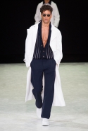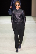 Внимание Джорджо Армани привлекает другими путями: например, предлагает не один фасон брюк, а целый десяток всех возможных. Свитера с кардиганами разрисовывает скромными полосками, зато к кожаной куртке добавляет плетеные элементы — сразу и не заметишь, но такое внимание к деталям обязательно окупается при близком знакомстве.