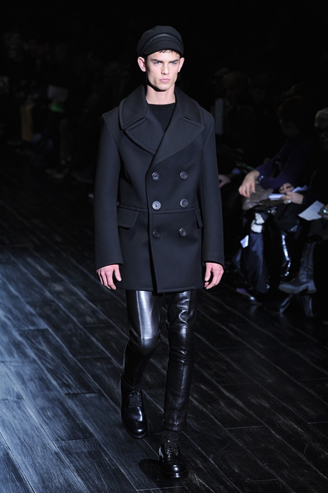 И хотя во второй половине показа коллеция заметно темнеет и из спокойной пастельной превращается в традиционно брутальную, — черные кожаные брюки, рубашки, фуражки, застегнутые на все пуговищы мундирного типа плащи, кое-где даже картинно поднятые воротники — запоминается больше все же первая часть.