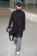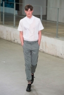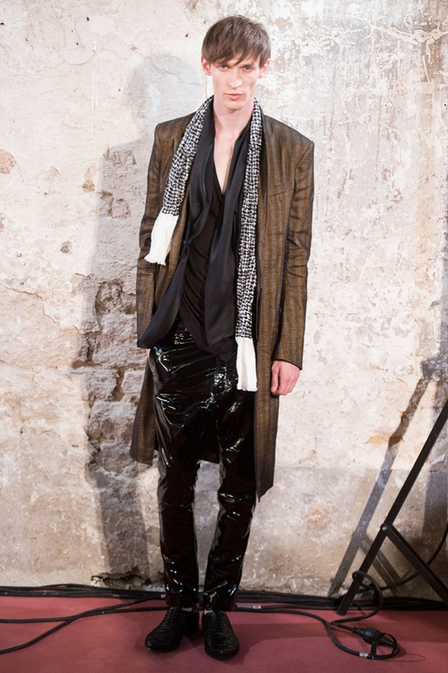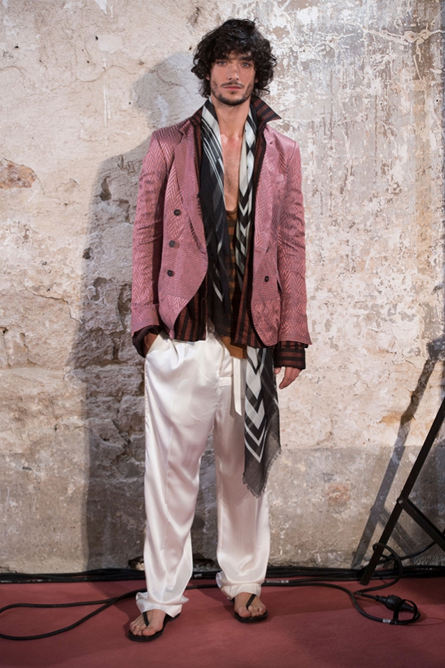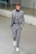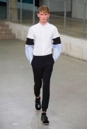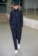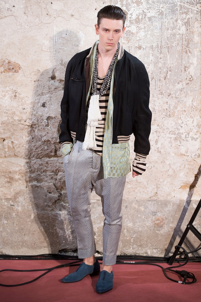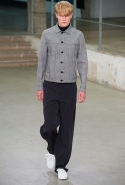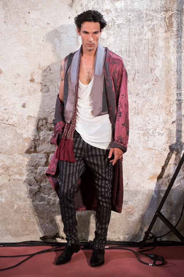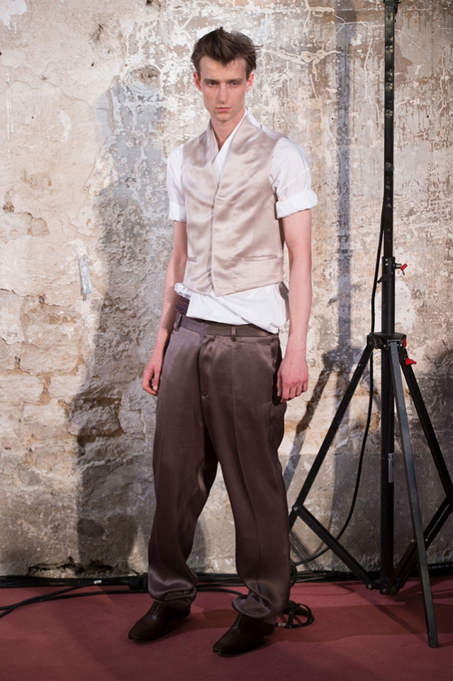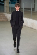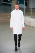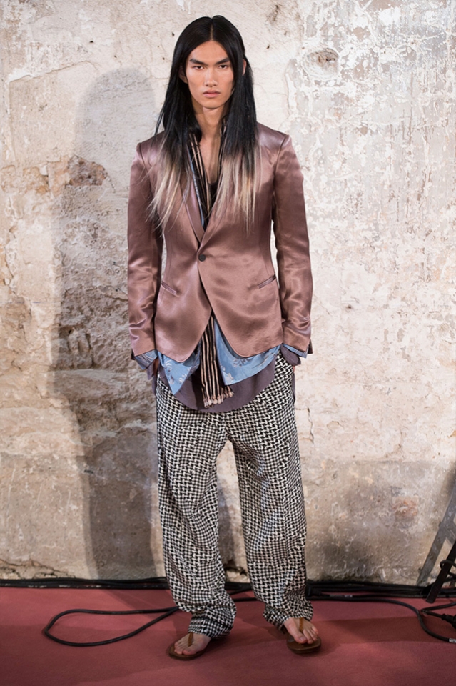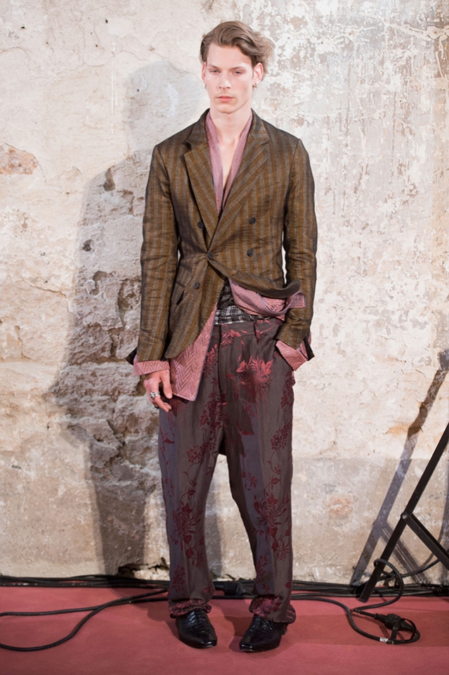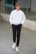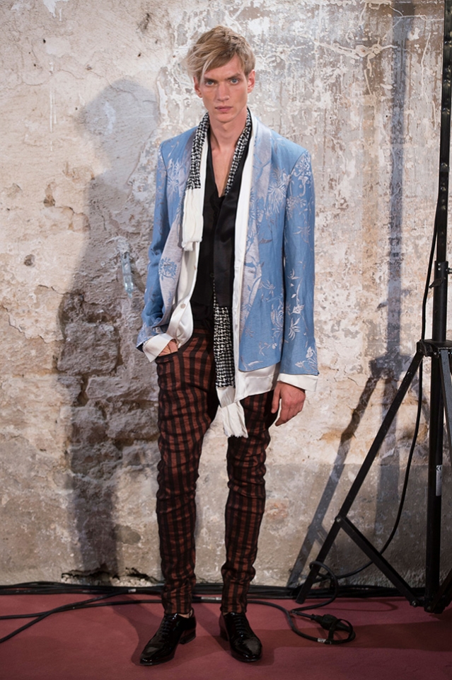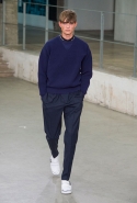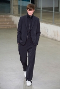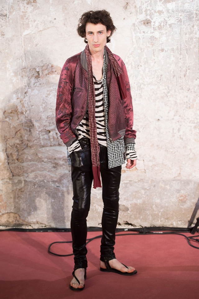 Небольшая коллекция, которую наравне с мужчинами-моделями представляли Саския де Брау и Лия Кебеде, стала идеальным воплощением стиля творческой богемы времен молодости Патти Смит и Роберта Мэпплторпа. Некоторые герои коллекции будто только что встали с постели — или матраса на полу в мастерской, который успешно ее заменяет, — накинув на пижаму первое, что попалось под руку. Другие похожи на рок-н-ролльщиков со стажем, которые никогда не изменяют разве что узким кожаным брюкам, а в личной жизни руководствуются другими правилами. Дизайнер смело смешивает текстуры, создавая расслабленные и будто случайные образы. Особенно хороша полоска, которая напоминает не столько о классическом морском стиле, сколько о карикатурных тюремных робах.