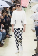Поэтому и настроение у коллекции получилось немного детским, ребяческим: отсюда и узор из огромных ярко-синих горошин, в некоторые из них вписаны Эйфелевы башенки, будто вырезанные из туристических буклетов; и жизнерадостные краски — небесно-голубая, оранжевая, мятная, нежно-розовая. И принты-портреты, выполненные в стилистике знаменитого изображения Че Гевары, похожи больше на мультипликационные грустные кошачьи мордочки или даже нашего любимого по детским мультсериалам персонажа, желтого озорного Пикачу. А Статуя Свободы, которая неожиданно тоже появляется на одной из маек, хотя об этом многие и не знают, родилась именно во Франции — ее создателем стал все тот же Эйфель. И стоит ее французская версия неподалеку от знаменитой Эйфелевой башни.