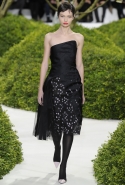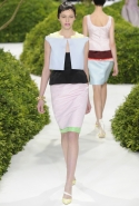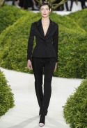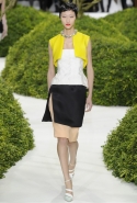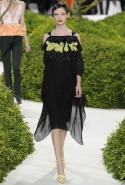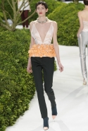 И вдруг, как по взмаху волшебной палочки, тут и там засверкали блики яркого цвета: канареечного желтого — на колготах, кораллового — на легком пальто с короткими рукавами, а нежного оранжевого — на баске белого топа, в виде лепестков цветов, словно приклеившихся к ткани. Желтое платье в пол сменялось рыжими брюками и блестящим розовым топом, и, пока яркие блики цвета постепенно исчезали из виду, на подиуме "распускалось" все больше цветов. Сначала цветы и листья появлялись только изображенными на ткани, потом они словно приподнялись, выросли, обрели объем и форму и усыпали крошечными бутонами длинные тюлевые перчатки. Совсем незаметно они вдруг оказались повсюду, словно живые, — белые и нежные, разноцветные и колючие, они покрыли полупрозрачные тюлевые платья снизу доверху, делая моделей похожими на роскошные живые клумбы.