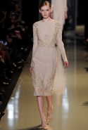 Цветовая палитра ограничена размытыми оттенками чайной розы, персикового, небесно-голубого, бежевого, алого и классического черного. Большинство творений дизайнера органично дополняют кружевные вставки, мягкая драпировка, кристаллы и вышивка, декоративные принты в виде мелких цветочных рисунков на шелке, шифоне, тюле. Тем не менее роль основного материала в коллекции вновь досталась полупрозрачной ткани, контрастирующей с крупной вышивкой.