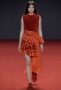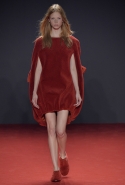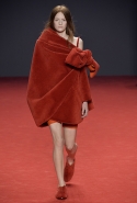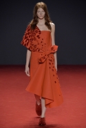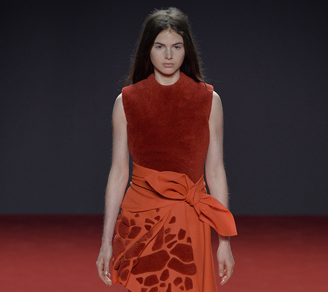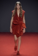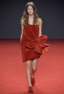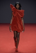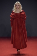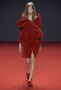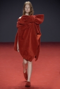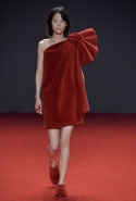 Новая коллекция во многом похожа на обе предыдущие: она вся выполнена в одном цвете, все силуэты очень похожи, и у всех есть одна главная общая деталь. Каждое платье выглядит так, будто модель обернулась махровым красным полотенцем, уголки которого завязаны в пышный красный бант, напоминающий банты на подарочной упаковке. Иногда полотенце старательно задрапировано и становится похоже на халат или даже коктейльное платье уже не махровое, а бархатное, а иногда и вовсе просто обернуто вокруг тела и подоткнуто где-то в районе груди. Совсем недавно мы писали о похожих моделях в коллекциях Chalayan и Ashish x Topshop, но, признаться, совсем не думали, что об этом странном микротренде придется вспомнить снова — тем более на Неделе haute couture.