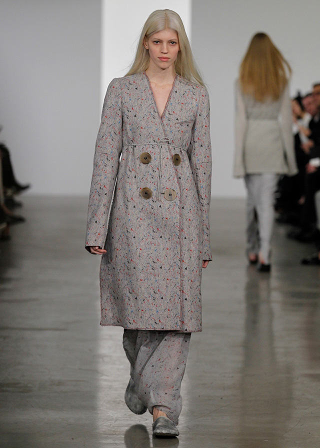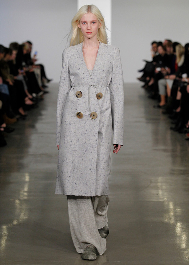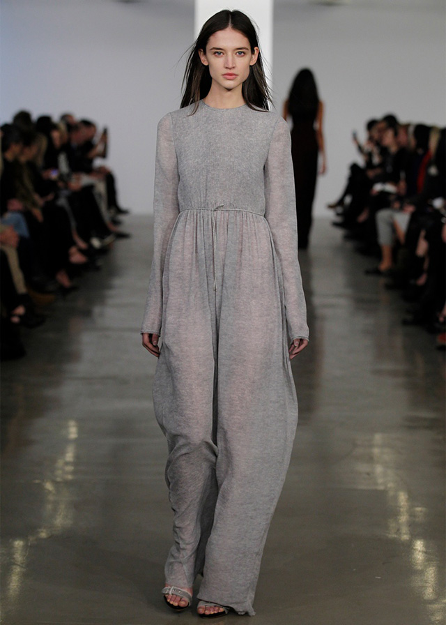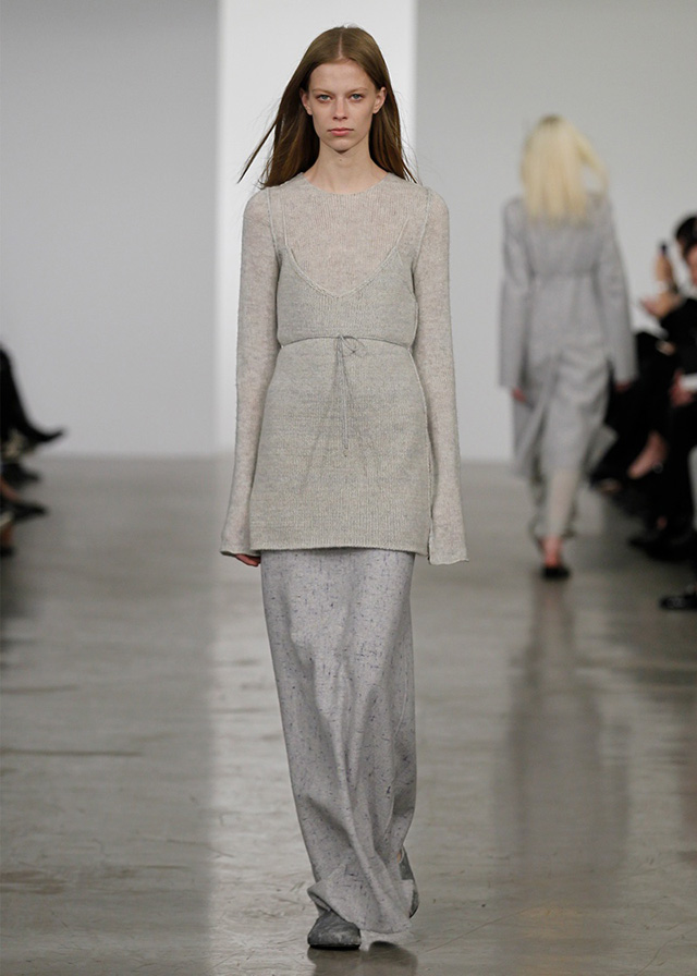 Вместо однотонных брючных костюмов и платьев на тонких бретельках, с которыми привычно ассоциируется подиумная линия Calvin Klein, модели выходят в уютных кашемировых свитерах, длинных юбках и широких мягких брюках, перевязанных поясками вязаных кардиганах и объемных пальто с огромными смешными пуговицами.