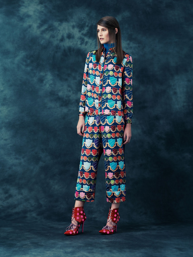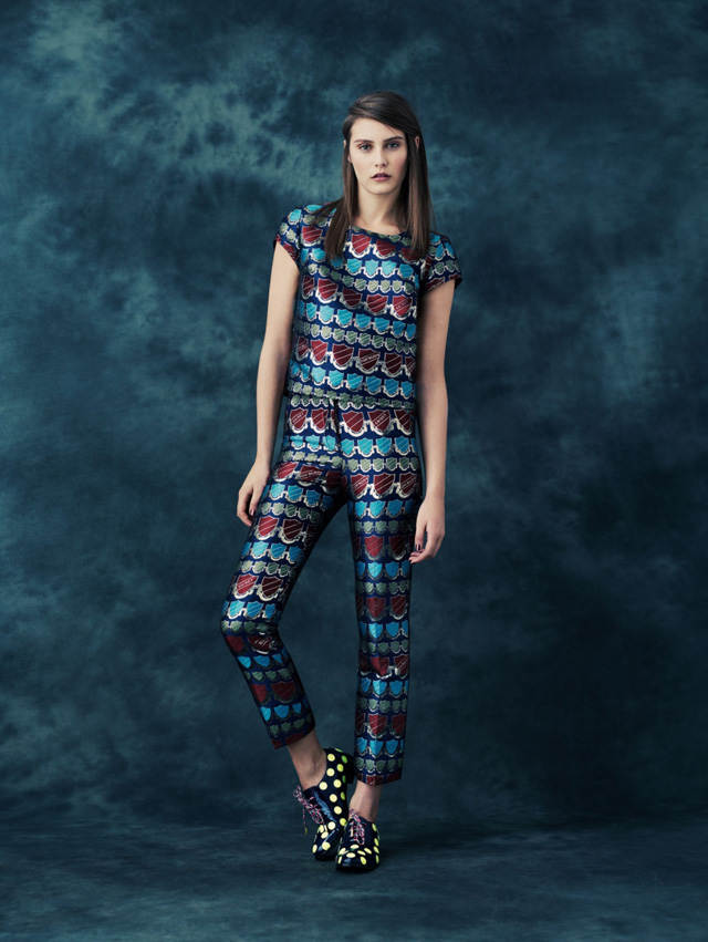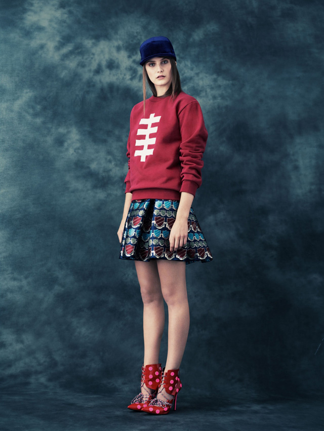 Вся одежда — это игривые вариации на тему стиля преппи. На костюмах принты из гербов-школьных эмблем, издалека похожих на нашитые разноцветные карманы, на свитшотах — аппликации из разноцветных букв английского алфавита. Те же буквы, как "алфавитные" магниты с холодильников, рассыпаются по юбкам, брюкам, платьям и рубашкам и складываются в слово "giddy" — "легкомысленный", "несерьезный". Серьезности ничуть не добавляют и туфли и ботинки в разноцветный горох, и меховые кепки, и нашитые на школьные бомберы вместо школьных эмблем надписи HOH — с одной стороны, аббревиатуры House of Holland, с другой — общее насмешливое и жизнерадостное настроение коллекции.
