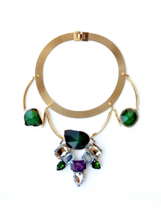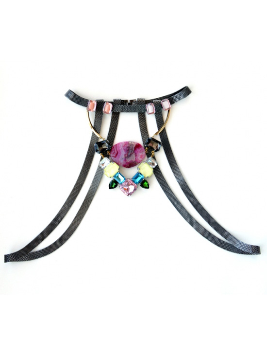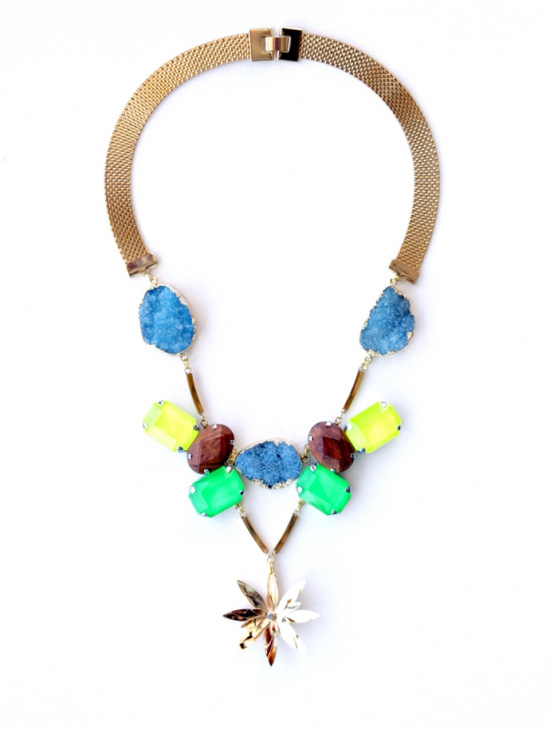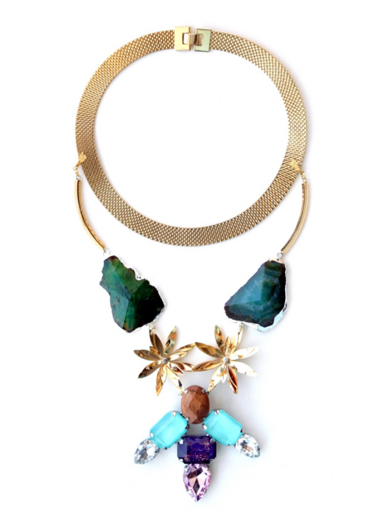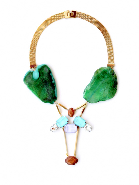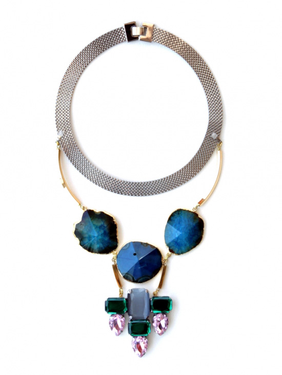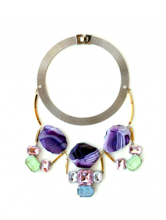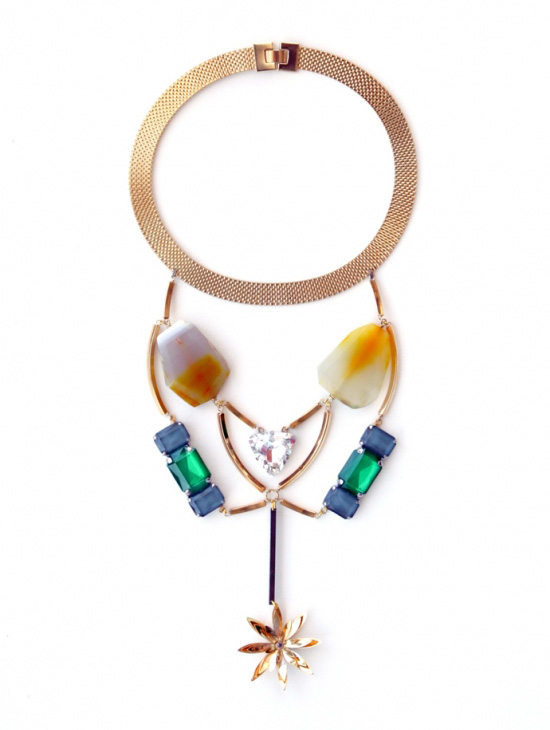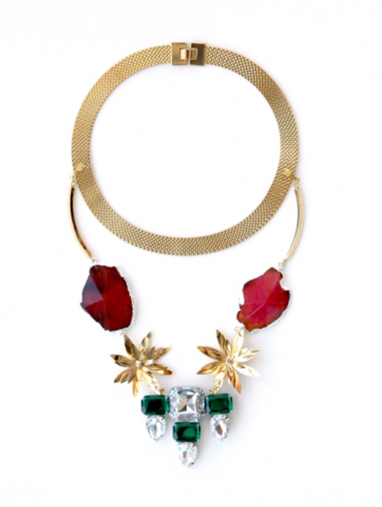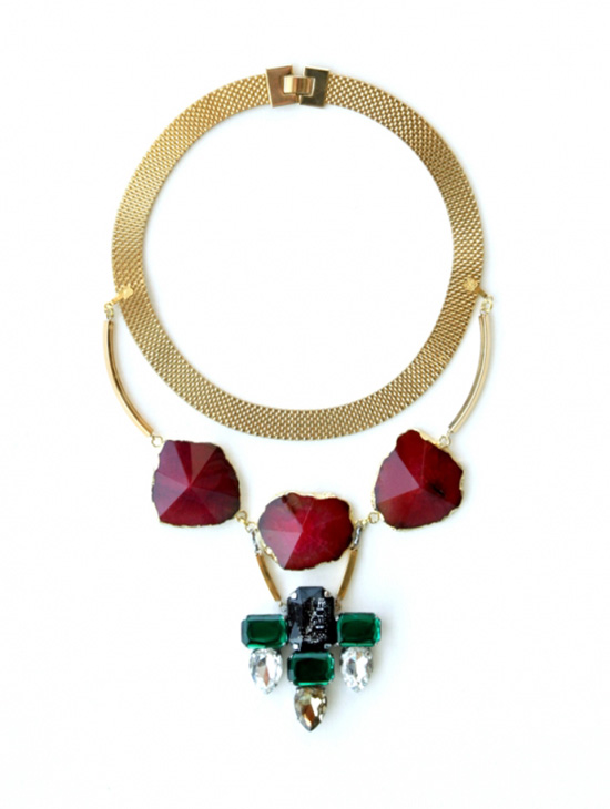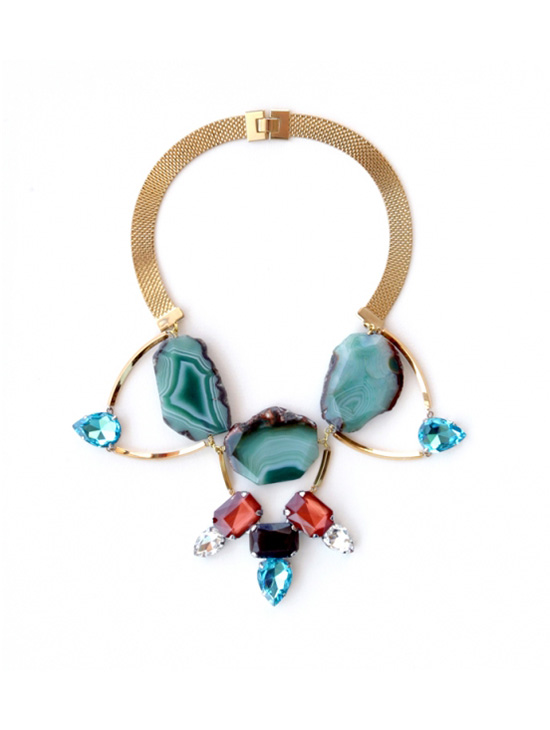 Материалами для создания колье, серег-клипсов, браслетов и повязок на голову стали агат — полудрагоценный камень из Бразилии, акриловые и деревянные стразы из Италии, текстиль, а также металл — бижутерный сплав.