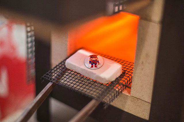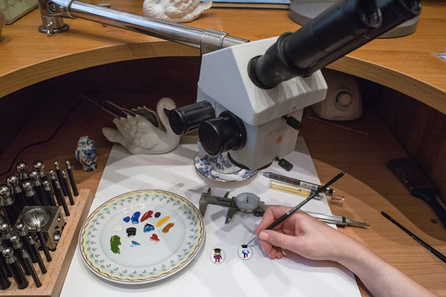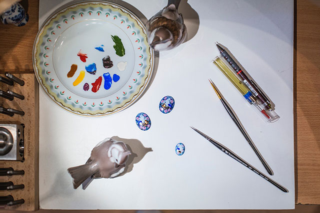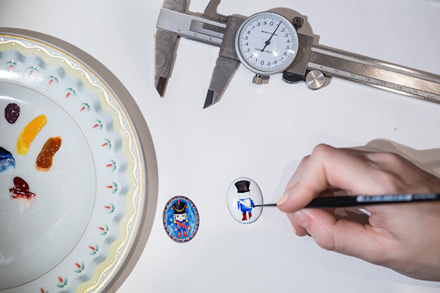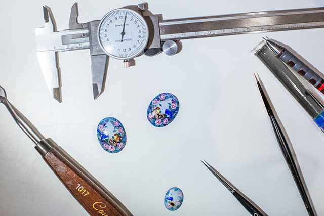 Эмаль, как выяснилось, не терпит универсального подхода. Над каждым видом росписи трудится определенный мастер: прямо как в старинных артелях, где были «цветники», занимавшиеся колористикой украшения, и художники «по личику», выписывавшие строгие взгляды святых и нежные улыбки девушек. Даже с технической точки зрения роспись по эмали — процесс сложный, что уж говорить о художественной ее части. Рисунок наносится под микроскопом или ювелирно-часовой лупой постепенно, слой за слоем: от эскиза (или подмалевка) к более детальному изображению. Но кропотливая работа того стоит — над результатом практически не властны годы, ведь густота цвета и глянец эмали стойко сопротивляются негативному воздействию ультрафиолета, перепадов температуры и других факторов. Эмалевые миниатюры во многих культурах ценились не меньше драгоценных камней. Да и растертые в порошок самоцветы часто входили в рецепт того или иного оттенка.
