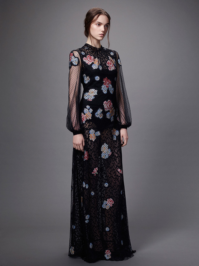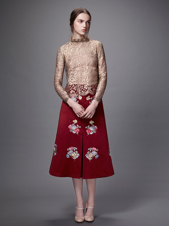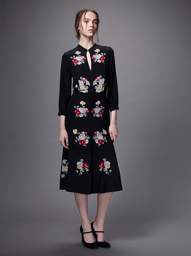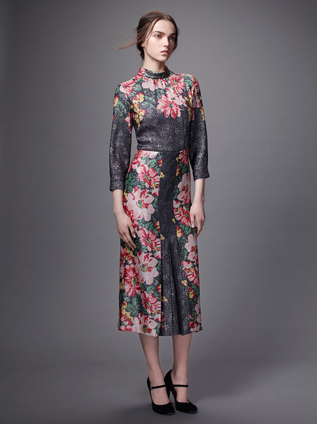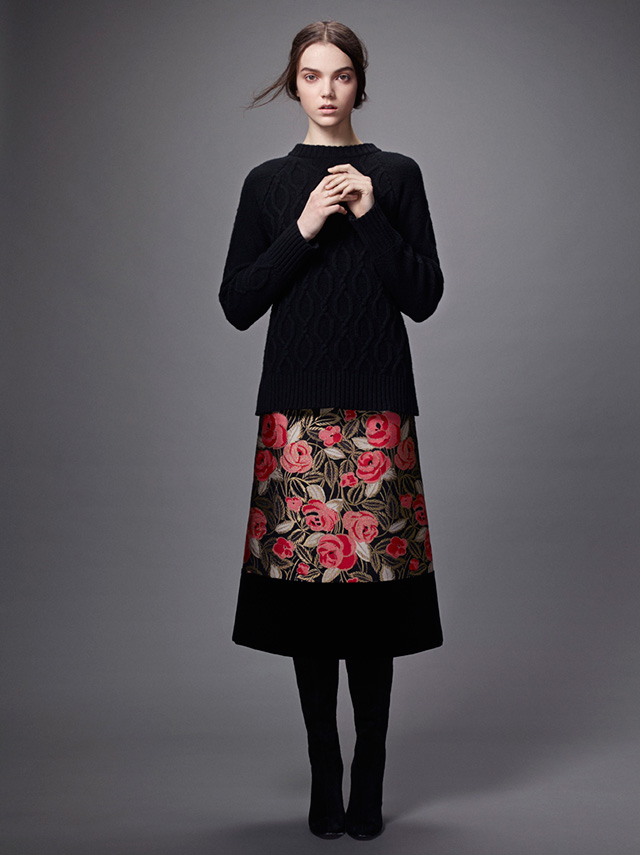 Мрачность осенне-зимней гаммы оттенков — Ольга Вильшенко больше всего использовала черный и бордовый — разбавляют цветочные узоры, которые отсылают нас к живописцам и иллюстраторам, таким как Васнецов и Билибин. Ими скромно, без излишества украшены жаккардовые и сатиновые юбки, шелковые платья, вельветовый жакет, шерстяной кейп и многие другие вещи из коллекции. Где-то цветы выглядят сошедшими с полотен, где-то — с изделий народных промыслов, но в обоих случаях они гармонично вписываются в общий стиль коллекции, изящный и женственный.