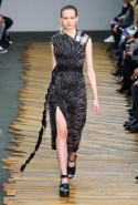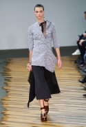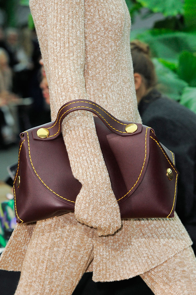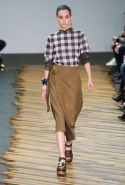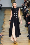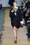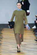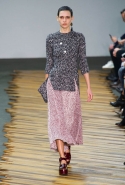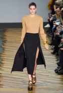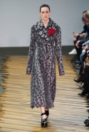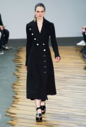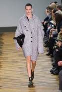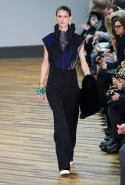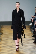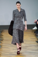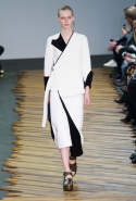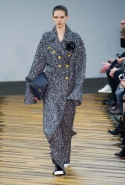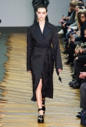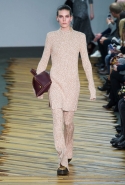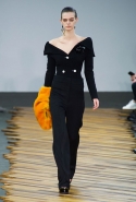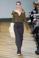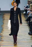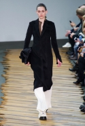 Мы видим дивные пальто и костюмы с юбками, брюки с очень изящными топами, мягко завернутые лацканы и отвороты, которые похожи на цветочные лепестки, — и снова подобия цветов на воротнике, как у Fendi и Dries Van Noten. Еще один неожиданный выход заставляет вспомнить показ Марка Джейкобса: вязаный костюм из удлиненного обтягивающего платья-водолазки и длинных брюк — у американского дизайнера был похожий костюм из "лапши".