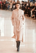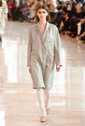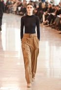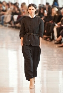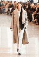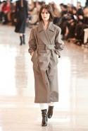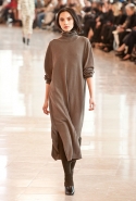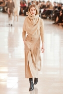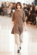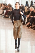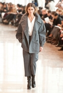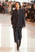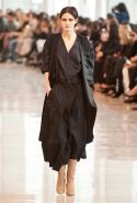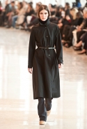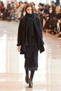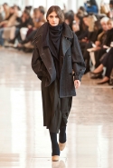 Объемные шарфы, гнездом замотанные вокруг шей, большие пальто и куртки, юбки ниже колена, а иногда и платья поверх юбок, узлы и небрежные складки, заломы — такой предстает осенне-зимняя коллекция Christophe Lemaire в первой половине показа. Это вещи, призванные не украшать их хозяйку и не подчеркивать фигуру (а большинство покупателей до сих пор почему-то считает эти задачи единственными, стоящими перед одеждой и модой в целом, — и в этой фразе действительно нет никакой иронии), а говорить. Точнее, высказываться — не через громкие заявления, а через показное молчание.