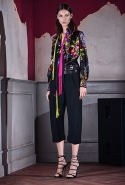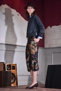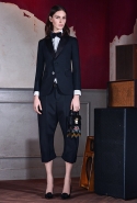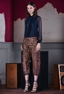 Длина каждого образа варьируется, но редко доходит до щиколотки, которую оплетают тонкие завязки туфель-сандалий, почти как на весна-лето 2015. Юбки и платья Кейтены предлагают сменить на укороченные брюки с низкой посадкой — шелковые с золотистым растительным принтом или черные из шерсти и шелка, которые с пиджаком и галстуком-бабочкой складываются в классический, несколько расслабленный образ, идеальный для деловой модницы.
