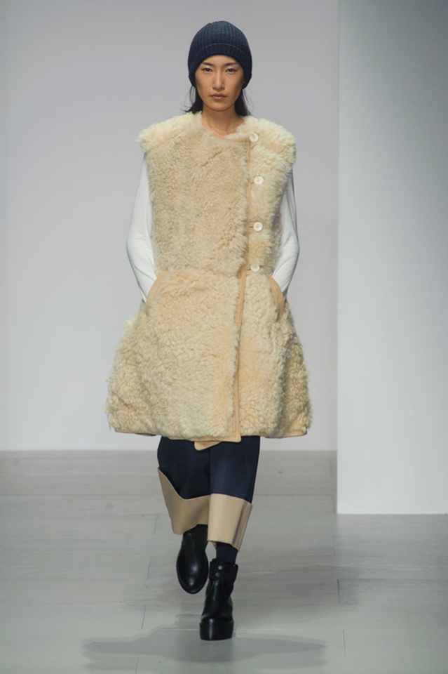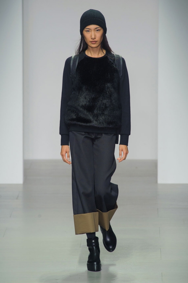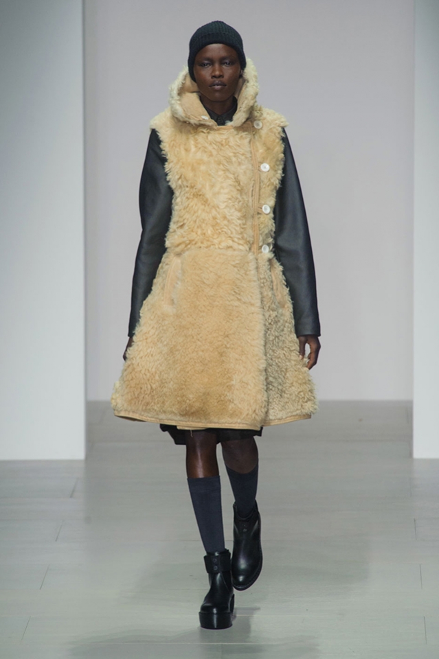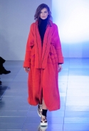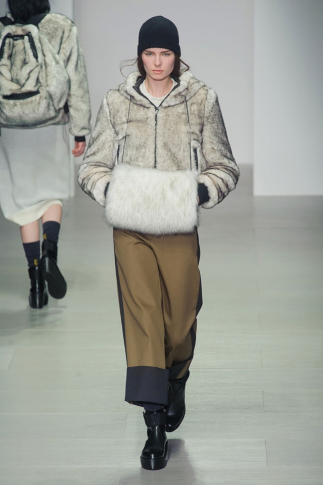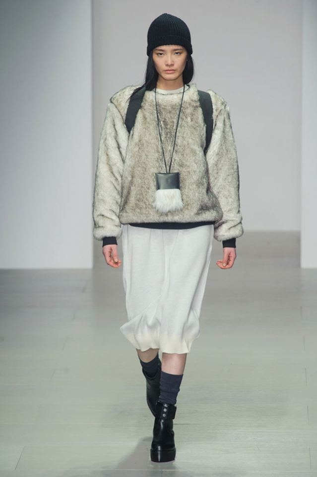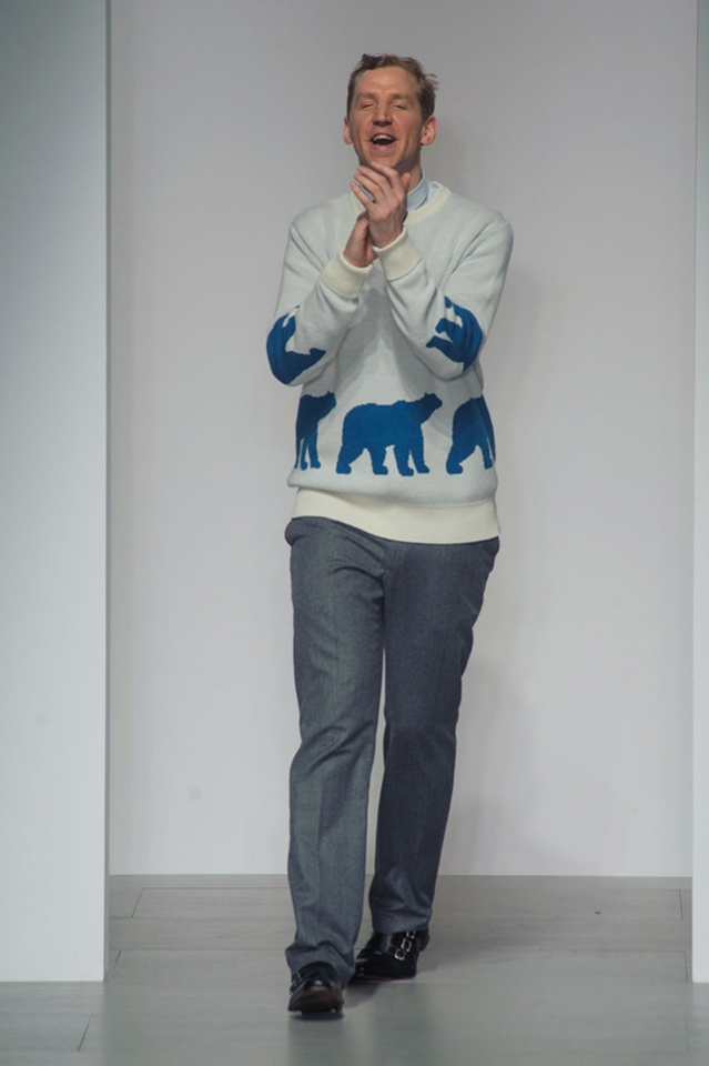 А вот Кристофер Реберн решил подойти к созданию осенне-зимней коллекции, сыграв на самой очевидной ассоциации с этим сезоном: в Лондоне, конечно, зимы не так суровы, как в России, поэтому источником вдохновения для него стала далекая Арктика. Пушистые шубы молочного цвета (вы ведь помните, что шкура белых медведей не чисто и безукоризненно белая, а именно такого цвета топленого молока?), парки, огромные карманы, пушистые муфты, свитшоты и даже худи. И, конечно, белые мишки на свитерах и нежно-голубой принт, имитирующий снежные узоры на замерзших стеклах. А сам дизайнер вышел на поклон в одном из таких свитеров, с синими медведями на белом фоне — как не оценить такую преданность выбранной тематике?