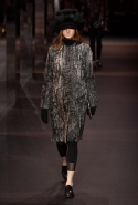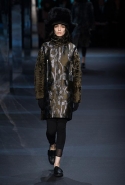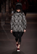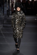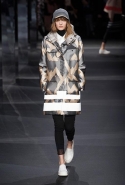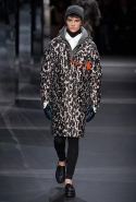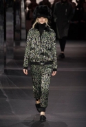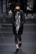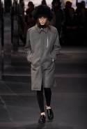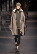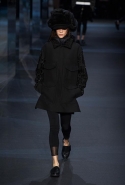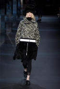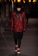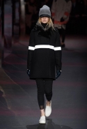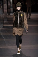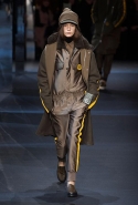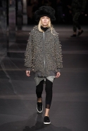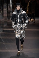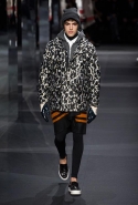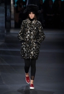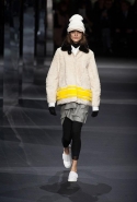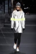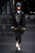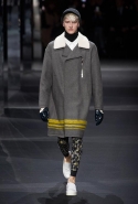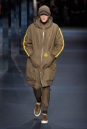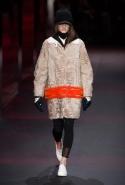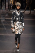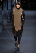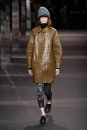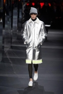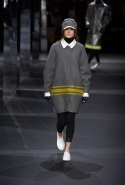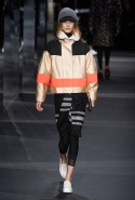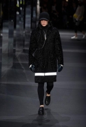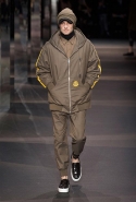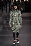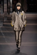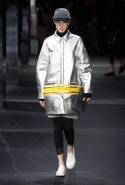 Все начинается с простых предупредительных полосок — кислотно-оранжевых на бежевом фоне, белых — на черном и желтых — на сером и серебряном. Потом появляются сперва просто защитные цвета, а после и вовсе камуфляж, да еще и в сочетании с огромными черными шапками, как у российских военных. Заканчивается показ куртками с цветочными рисунками, но комбинезоны цвета хаки, вышитые желтыми нитями эмблемы и желтые полосы по бокам брючин, как на парадной военной форме, все равно так просто не забываются.