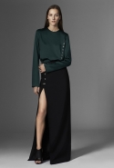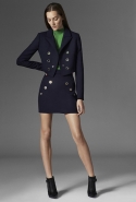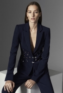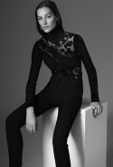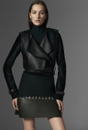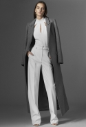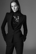Основное обращение к реальному миру в новой коллекции — пальто, благодаря вязаному вырезу нивелирующее строгость силуэта. В прямом смысле слова скромное обаяние буржуазии: темно-зеленый, глубокий морской и бургунди перекликаются с серебряными металлическими застежками на куртках и вставками кожи на юбках, жакетах и рубашках. Сам Кома говорит, что "Mugler без кожи — не Mugler". А мы и рады.