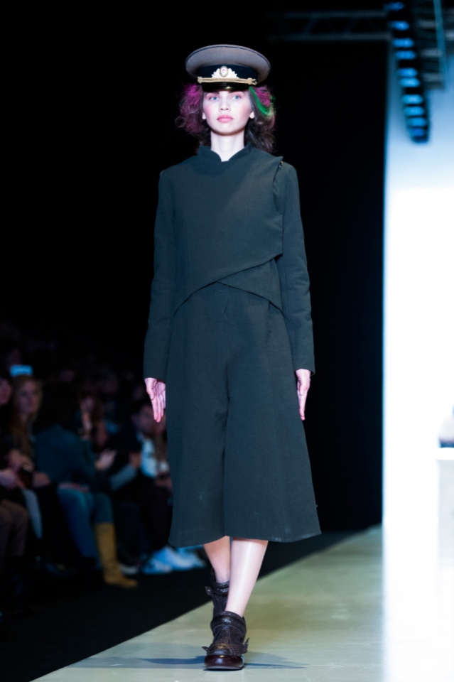 Но творческую, авангардную девушку Ria Keburia все равно что-то выдает: под военной фуражкой — копна ярких, разноцветных волос, у несколько сурового закрытого платья, похожего на мрачный черный обелиск, очень скульптурная, красивая спина. В паре с камуфляжным кроп-свитером идет укороченная спереди юбка, составленная из геометричных блоков и напоминающая о крыльях жука. Стеганый топ, похожий на корсет или бронежилет, не сковывает тело, а мягко обвивает торс идущей по подиуму модели. Да и черный, и другие темные цвета и оттенки здесь не предвестники беды, не тревожные сигналы, а символ твердости, которая понадобится нам всем. Чтобы, сняв наконец свои футляры и броню, остаться тем же человеком, что и до объявления внутреннего военного положения.
