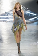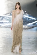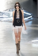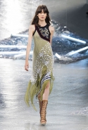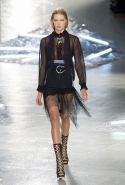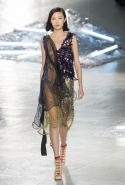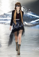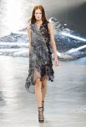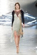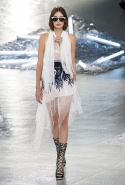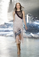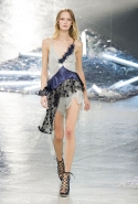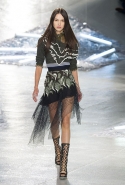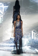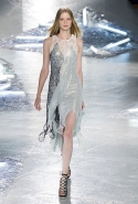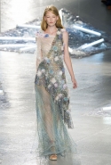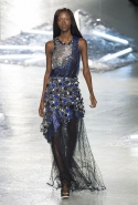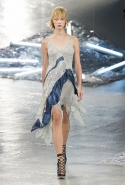 Потом их сменяют один за другим похожие платья ледяных принцесс — серебристые и голубоватые, чуть блестящие и местами прозрачные. Выглядит это красиво и нежно, но сестры Родарте не были бы самими собой, если бы не обшили их поверх меховыми помпонами или хотя бы чем-то, напоминающим черные спутанные ветки. Впрочем, как ни странно, даже эти весьма сомнительные детали общего впечатления все-таки не портят.