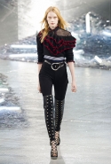 Вот на подиум выходит девушка в высоких ботфортах, обтягивающих брюках с высокой талией, в топе с пышной оборкой поверх. За ней — модель в куртке, напоминающей то ли спортивный бомбер, то ли теплую парку. Рукава и карманы куртки (а их, на минуточку, целых четыре, и все совершенно гулливеровских размеров) усыпаны серебристыми пайетками. Получается похоже одновременно и на космическую пыль, и на рыбью чешую, и на доспехи, но нам все же хочется думать, что это осевший, как на узорчатых зимних окнах, иней. Те же куски будто осыпающейся на ходу чешуи преследуют зрителя и дальше.