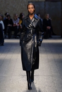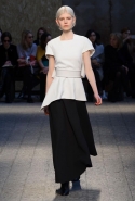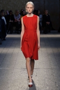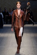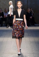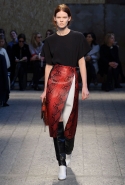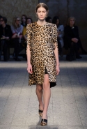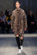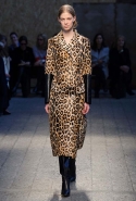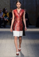 Силуэты и формы довольно просты, их легко можно вписать в простейшие геометрические фигуры: от треугольников до трапеций. И тем интересней следить, как меняется от первых выходов к последним их наполнение. Сначала это хорошо знакомый нам леопардовый принт — в его скромной, совсем не вызывающей вариации. В этом принте выполнен, например, костюм из юбки-миди и глухого свитшота с коротким стоячим воротником — трудно представить что-то более закрытое. Леопарду аккомпанирует контрастное сочетание черного и белого. Потом появляется змеиная шкура как в виде объемных, самостоятельных предметов вроде пальто, так и в виде небольших вставок на платьях. Эффектней всего выглядит асимметричная красная юбка из кожи питона.