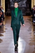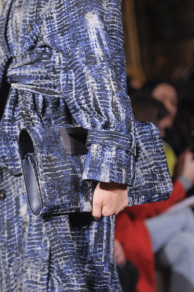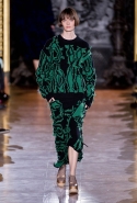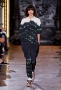 После нескольких ладно скроенных простых костюмов глубоких цветов и oversize-пальто, покрытых белыми контурными цветами, история разворачивается в новом, неожиданном ключе. Те самые белые контуры обретают объем и цвет, пальто становятся все сложнее и асимметричней, а потом Стелла МакКартни повторяет прием, примененный Фиби Файло в осенне-зимней коллекции Céline 2013 года с завязанными на груди ложными рукавами. Те вещи Céline стали настоящим хитом и появились во всех модных журналах, даже несмотря на скандал с плагиатом: Файло обвинили в том, что она просто скопировала подобную модель Джеффри Бина, выпущенную еще в 2004. Сомневаемся, что МакКартни пропустила этот скандал, поэтому использовала мотив наверняка не без умысла — какого, остается пока только догадываться. В коллекции Stella McCartney эти вещи, в любом случае, выглядят абсолютно иначе благодаря мелким дробленым принтам.