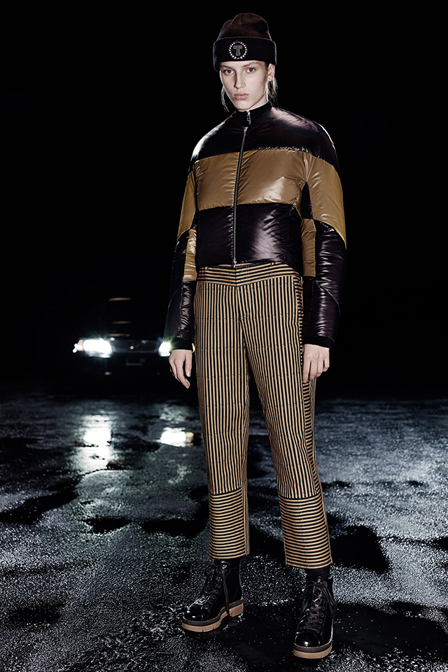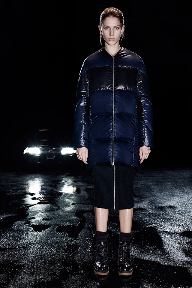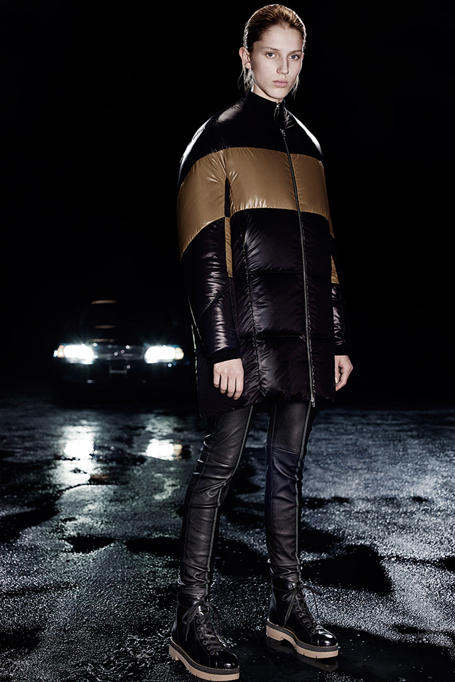 Поклонникам марки оставили полюбившиеся массивные пуховики, свободные платья-майки с контрастными полосками, как на футбольных гетрах, и куртки, при этом выглядят они уже не так, словно только что вместе со своей хозяйкой вышли из спортзала, а довольно нейтрально. Компанию им составляют укороченные брюки, трикотажные топы с фактурными узорами, кожаные мини-юбки и грубые ботинки на шнуровке.