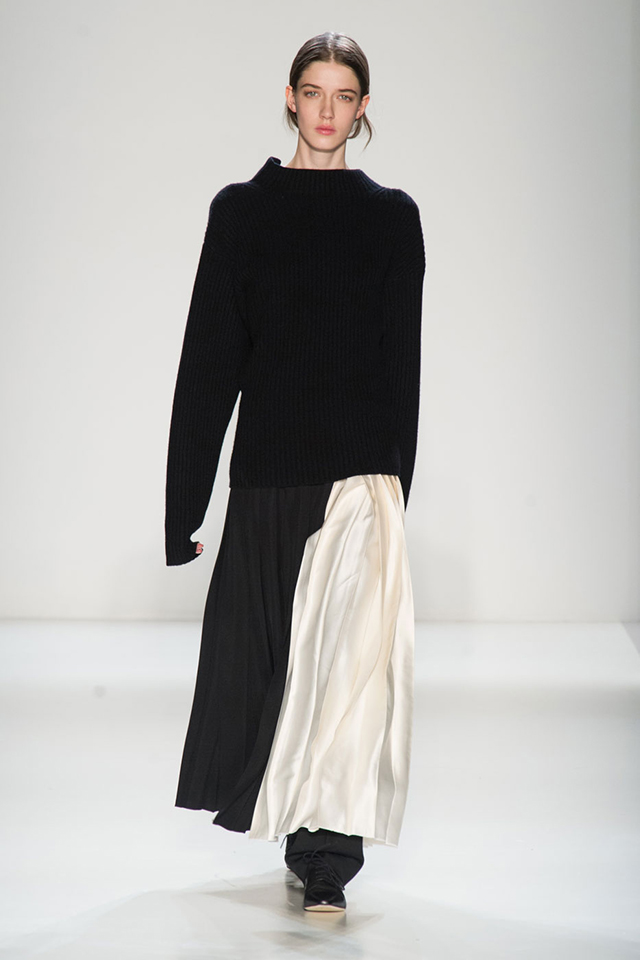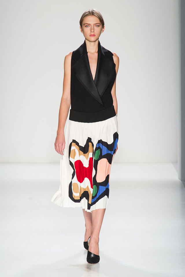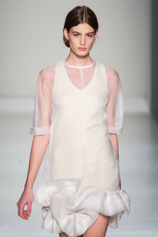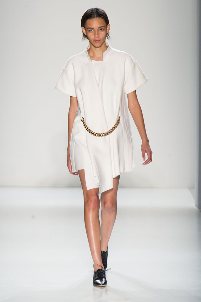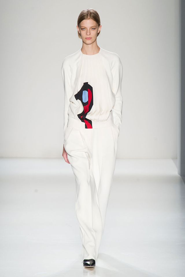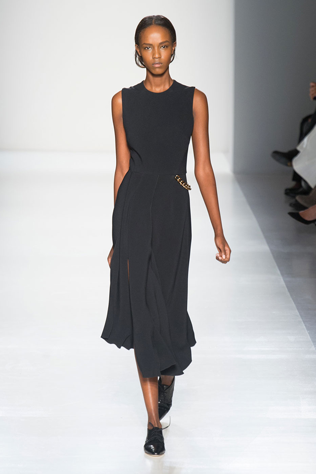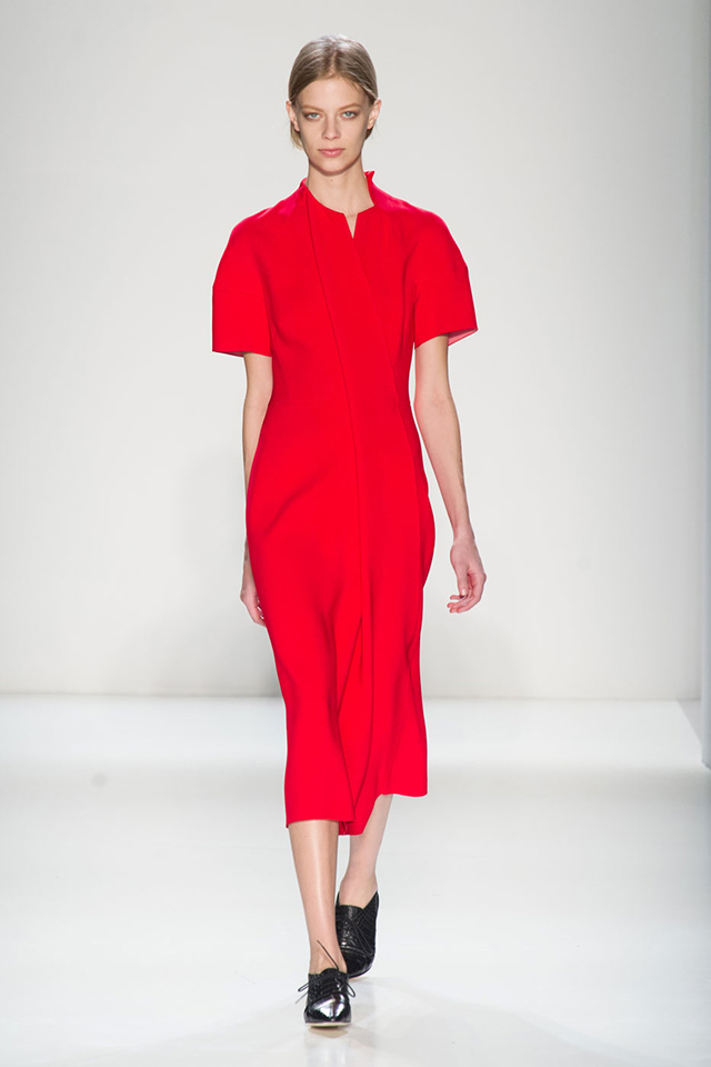 Девушка Victoria Beckham, кажется, очень похожа на саму основательницу марки: вечные высокие каблуки, узкие платья, солнцезащитные очки, закрывающие пол-лица, и никаких улыбок — серьезной бизнес-леди такие ужимки не по статусу. И хотя все, кто общался с Викторией лично, наперебой убеждают, что она действительно очень профессиональна и серьезно подходит к делу, но при этом добрейшей души человек, суровое, лишенное эмоций лицо всегда побеждает рассказы очевидцев. Однако лед, кажется, тронулся — по крайней мере, на подиуме. Те же без изысков базовые цвета — черный, белый и красный, — но к графичным линиям добавляются мягкие и плавные, ткани не обтягивают тело, а осторожно его окутывают, только намечая изгибы.