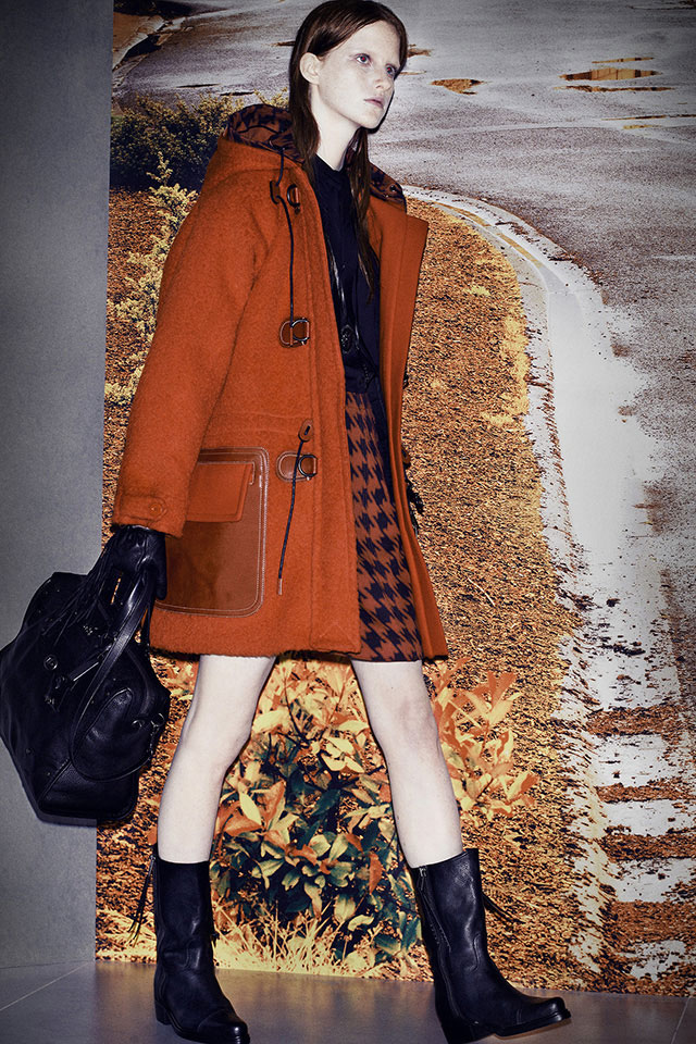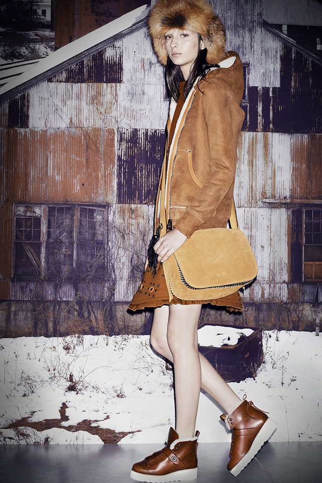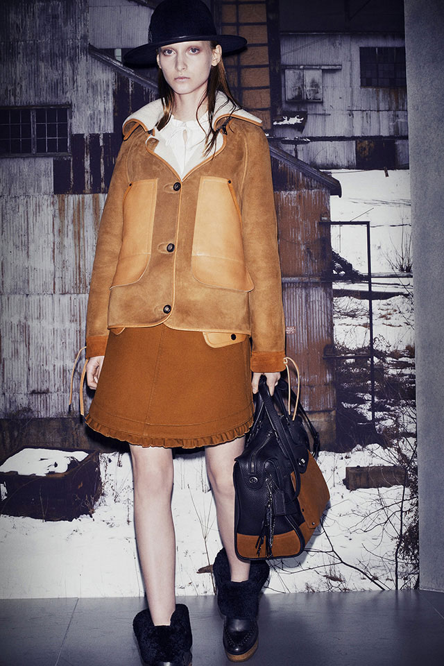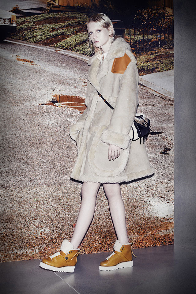 В центре внимания оказалась, традиционно для Coach, верхняя одежда: пальто в огромную "гусиную лапку" с черными кожаными манжетами и эполетами, шерстяные пальто-дафлкоты, желтые и коричневые дубленки и oversize-бежевая — все ее лацканы, отвороты и швы оторочены мехом, и она больше всего похожа на огромного пушистого йети. А вот аксессуары на фоне разнообразных пальто и курток совершенно теряются — бросаются в глаза разве что черные шляпы с вырезанными из кожи перышками. Вряд ли эти сумки с бахромой можно назвать потенциальными it-bags, и идея Виверса поднять цены на продукцию Coach (со средней цены 500 долларов до нескольких тысяч) кажется очень сомнительной. А вот к обуви действительно стоит приглядеться получше: хайкеры в интерпретации Стюарта Виверса, получившие название Lynea, на первый взгляд кажутся немного несуразными, но чем больше на них смотришь, тем больше они начинают нравиться. И в конце концов, их толстые подошвы и пушистые "язычки" превращают эту обувь в едва ли не самый идеальный вариант для зимы.