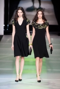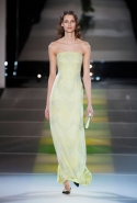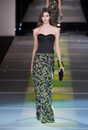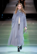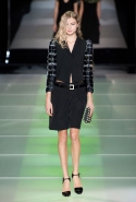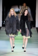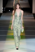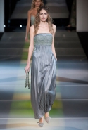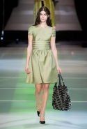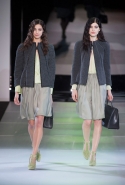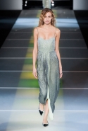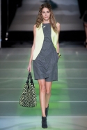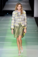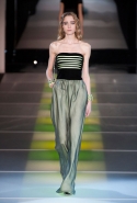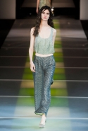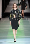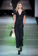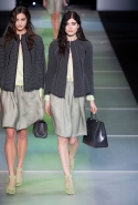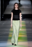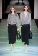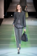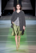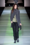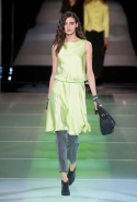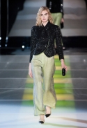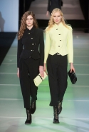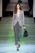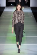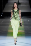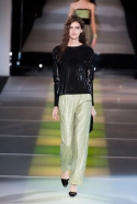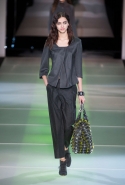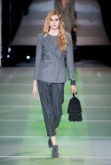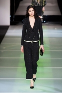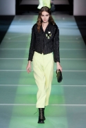 Неожиданные детали добавляют плавным и свободным вещам немного необходимой жесткости — к элегантному костюму добавляются военные высокие ботинки на шнуровке, сквозь светло-серую меховую бахрому просвечивает кричащий неоново-желтый, а сумки из клочков меха серого и ядовито-зеленого цвета выглядят героями абсолютно нашего времени. Новыми для Giorgio Armani оказываются и пропорции, и местами совершенно неожиданный крой. Ярче всего это заметно, когда на подиуме появляется девушка в укороченном объемном жакете "под змею", который слегка обнажает живот, хотя надет с высокими укороченными брюками. Фигура кажется инопланетной с коротким туловищем и совершенно бесконечными ногами. А разве не о таком соотношении мечтают девушки, выбирая идеальный брючный костюм?
