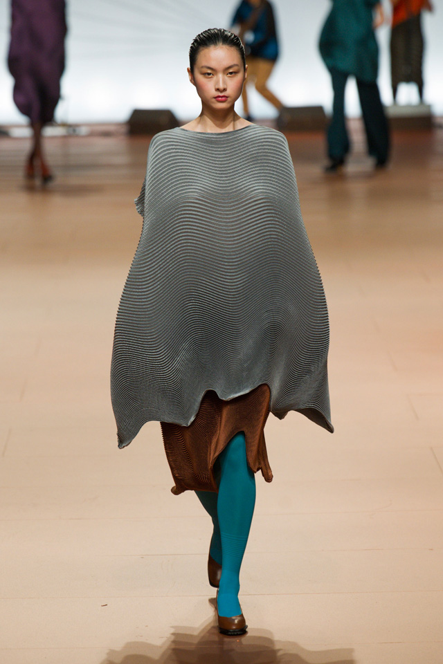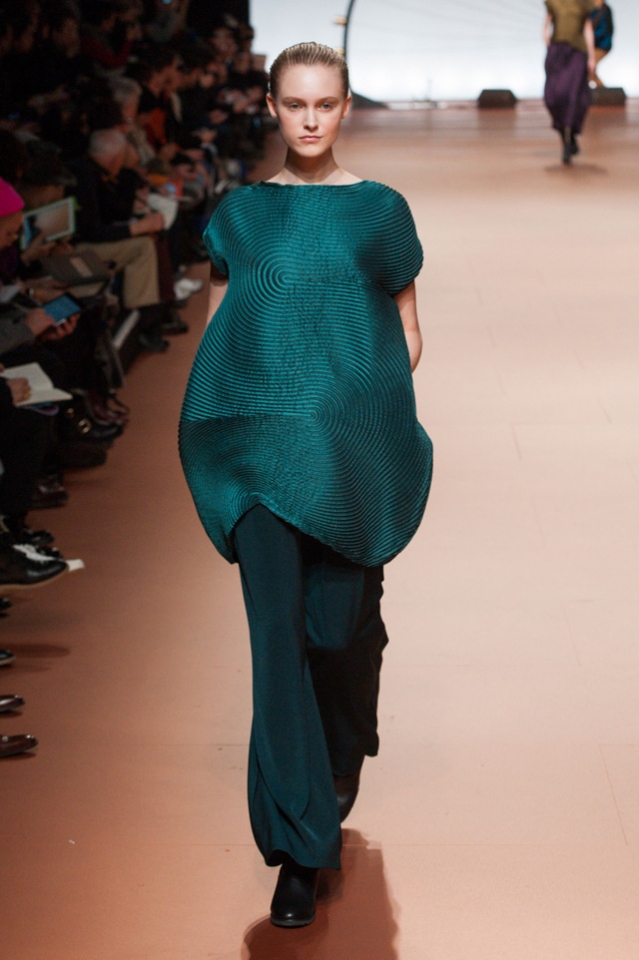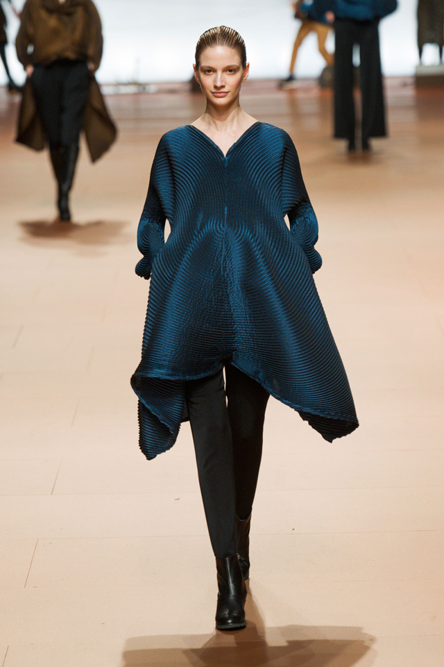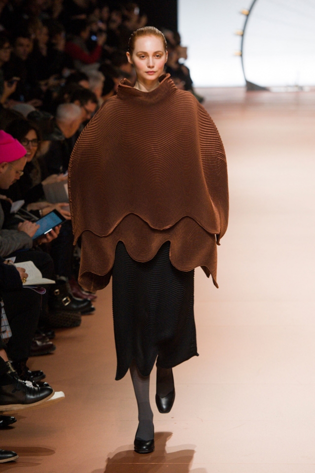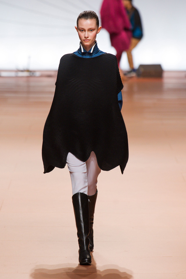 Вздутые, искаженные формы, графичный рисунок — геометрию могут вносить не только пресловутый color blocking или клетка, но и расчерченные черным маркером круги, которые рассыпаются прямо на вещах на кусочки и мозаикой собираются заново. По-настоящему знаковыми вещами из новой коллекции Issey Miyake станут пальто и (особенно!) кейпы — за их мягкие, плавные и сглаженные линии, обрезанный волной край и изящный облачный вид.