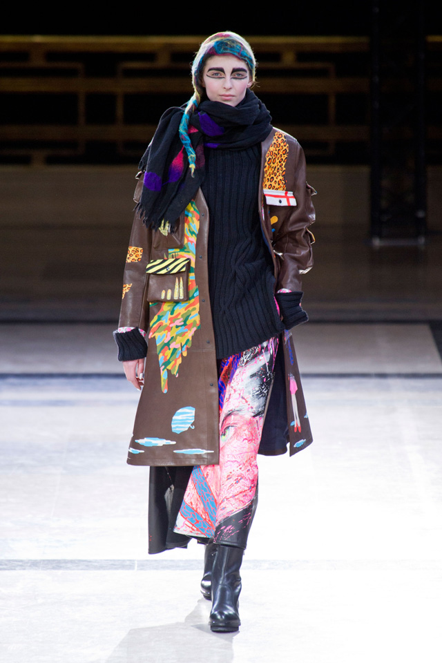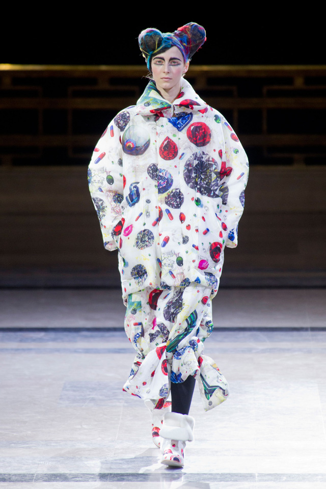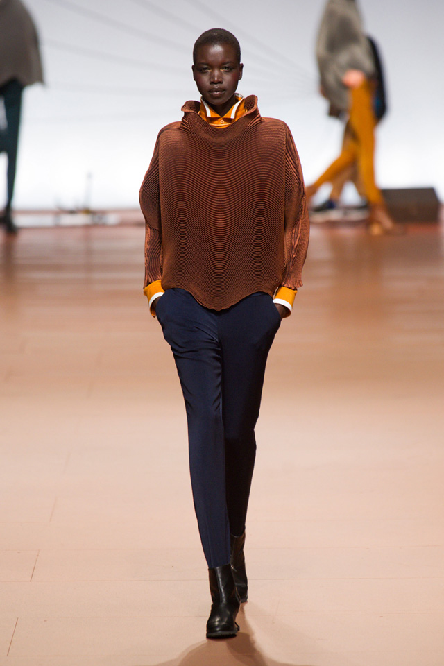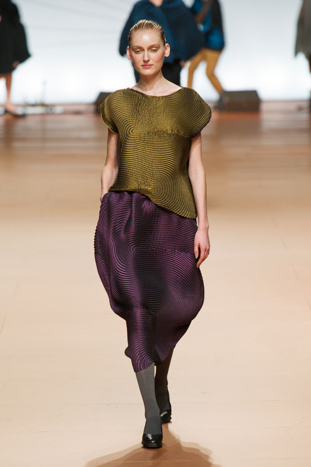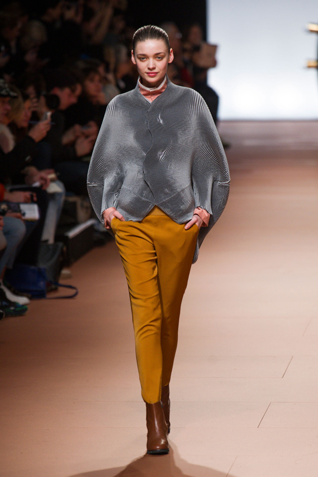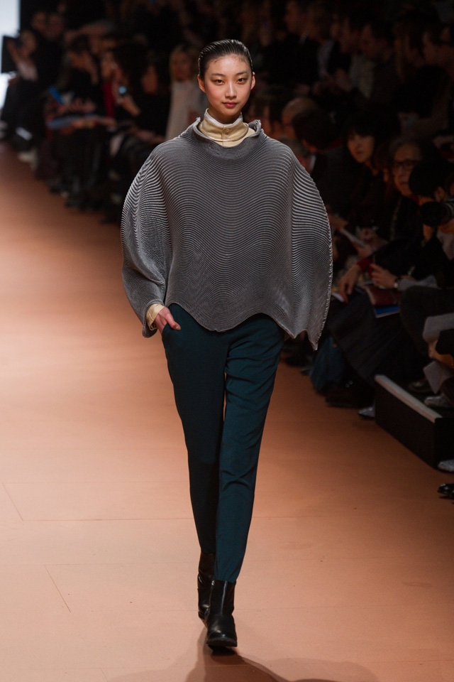 Вздутые, искаженные формы, графичный рисунок — геометрию могут вносить не только пресловутый color blocking или клетка, но и расчерченные черным маркером круги, которые рассыпаются прямо на вещах на кусочки и мозаикой собираются заново. По-настоящему знаковыми вещами из новой коллекции Issey Miyake станут пальто и (особенно!) кейпы — за их мягкие, плавные и сглаженные линии, обрезанный волной край и изящный облачный вид.