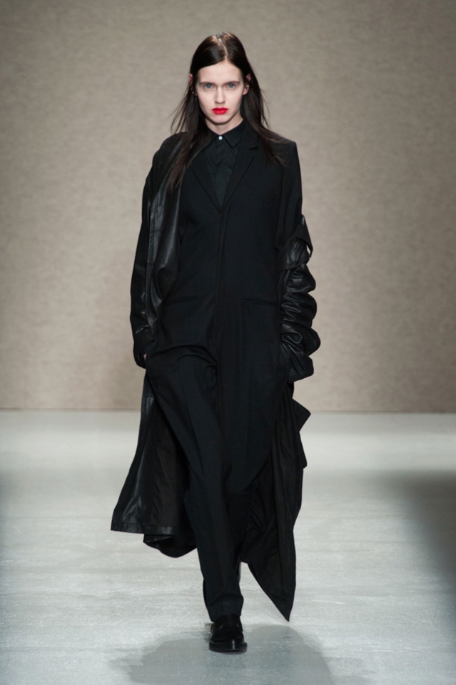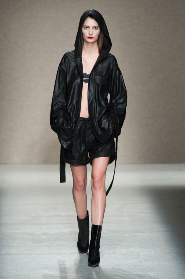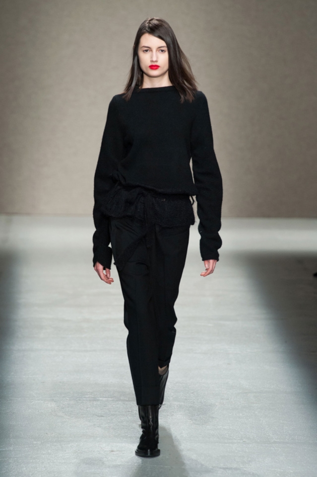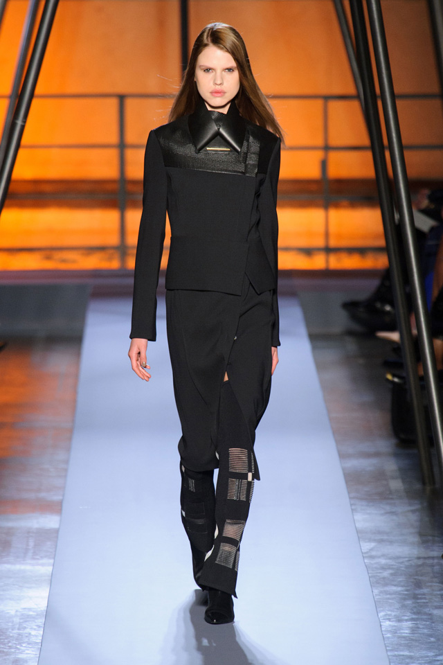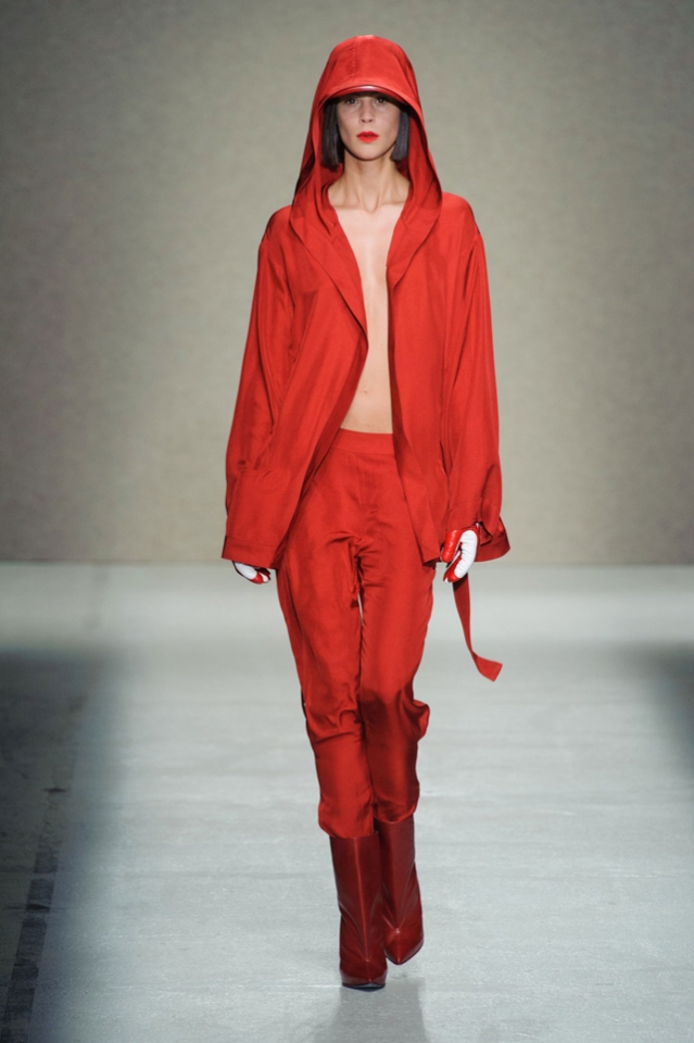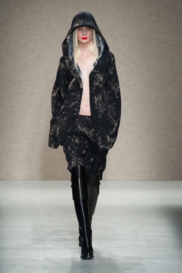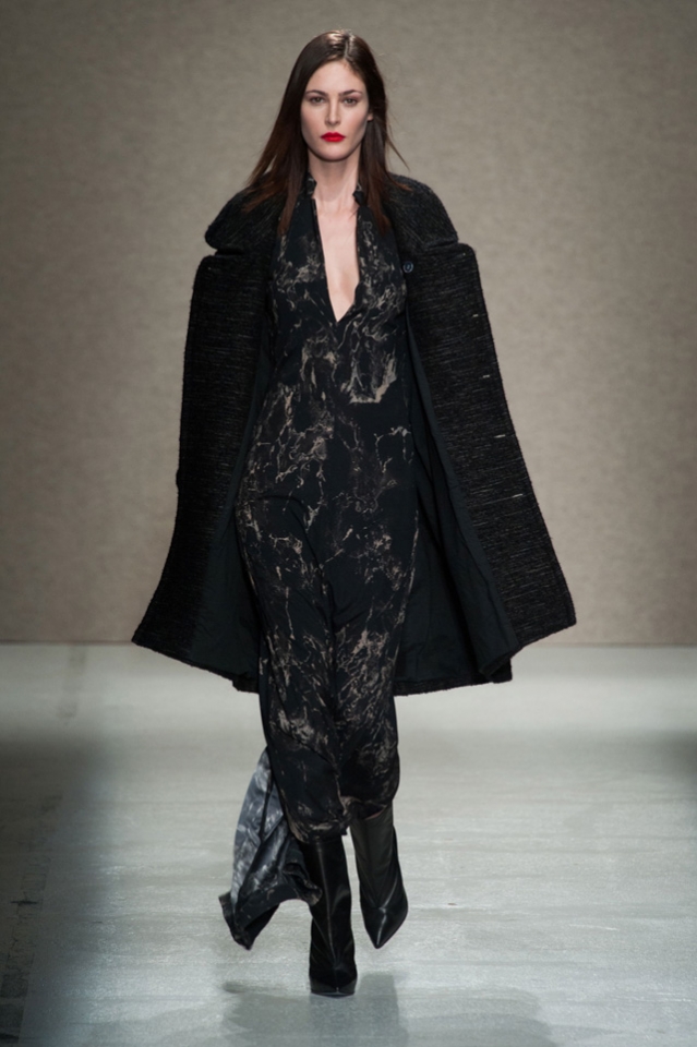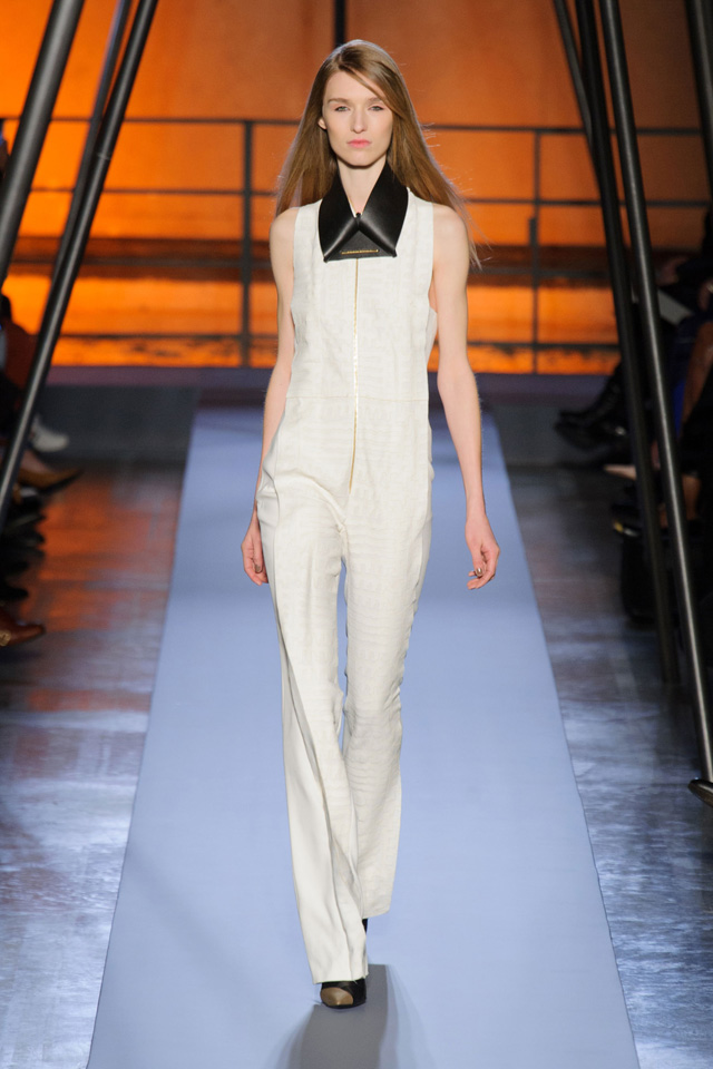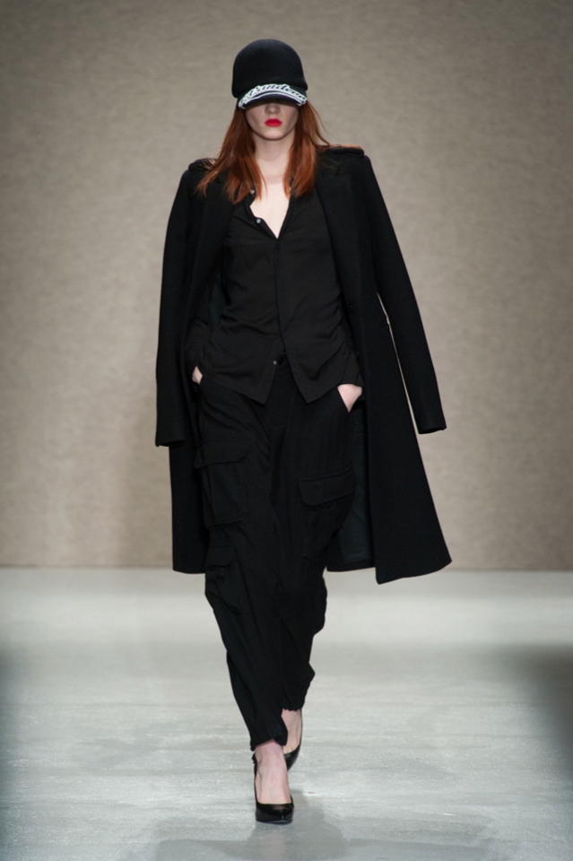 Мини-платье, похожее на небрежно завязанную (на самом деле, тщательно задрапированную) рубашку бойфренда, черный костюм в светло-серую трещинку — на военную униформу (вполне свежий и нетрадиционный взгляд на тему камуфляжа), а широкие брюки оказываются самыми что ни на есть настоящими галифе. Обращения A.F. Vandevorst к милитари-тематике иногда неожиданно буквальны, как в случае летных комбинезонов, и самая первая часть коллекции благородного серого оттенка кажется куда убедительней продолжения.