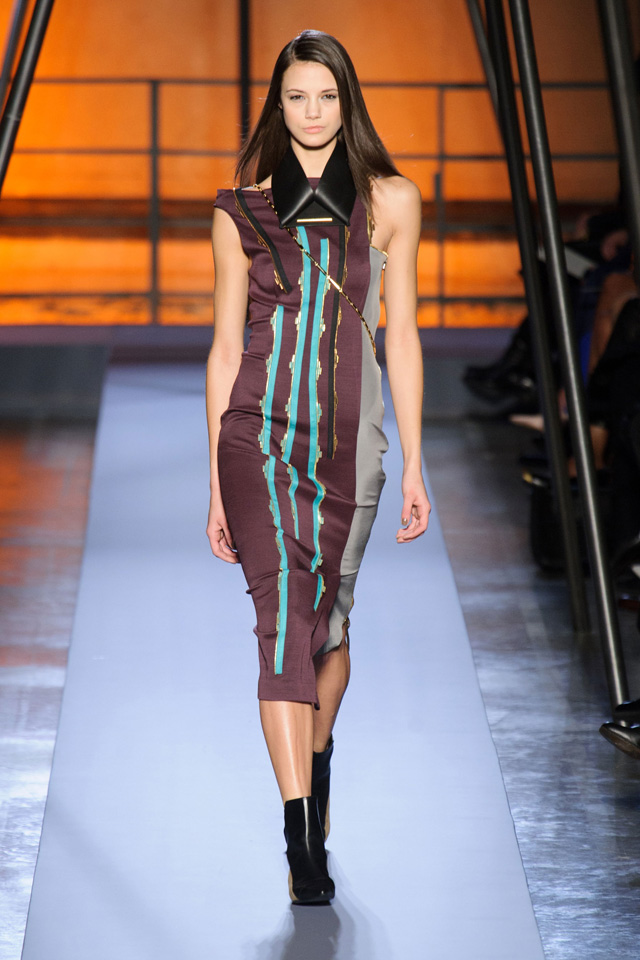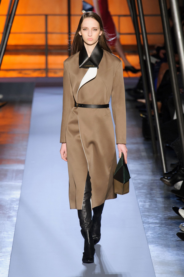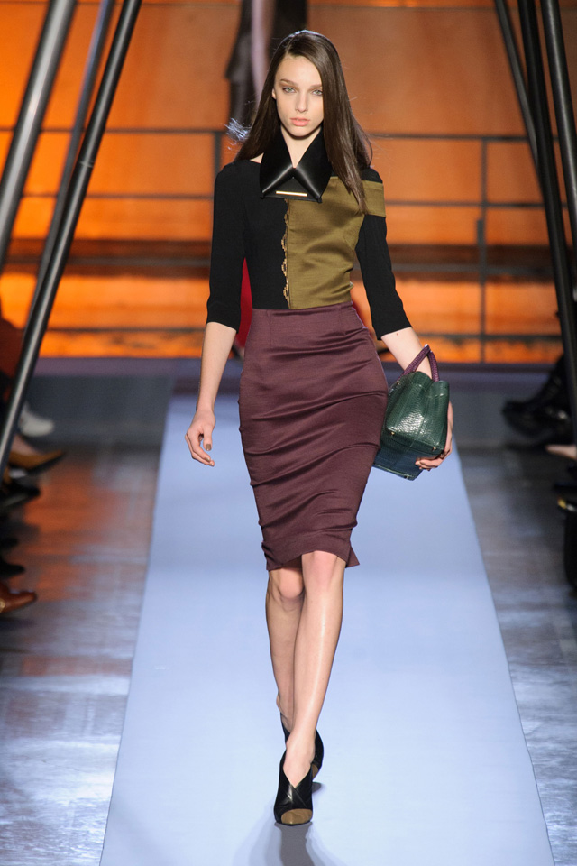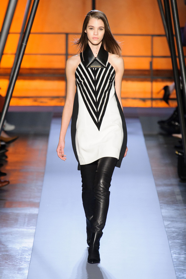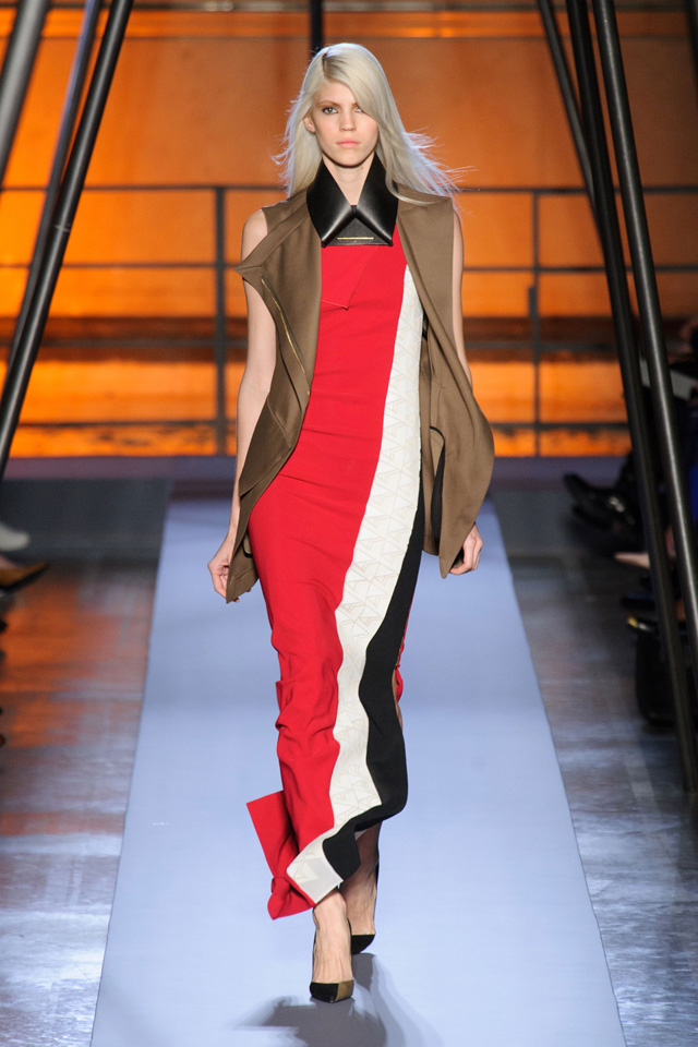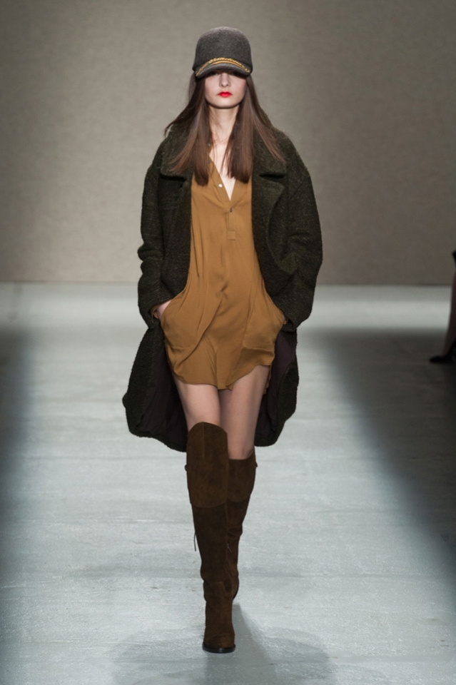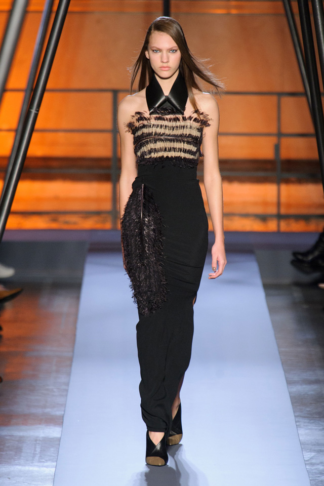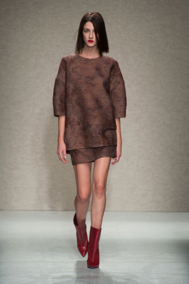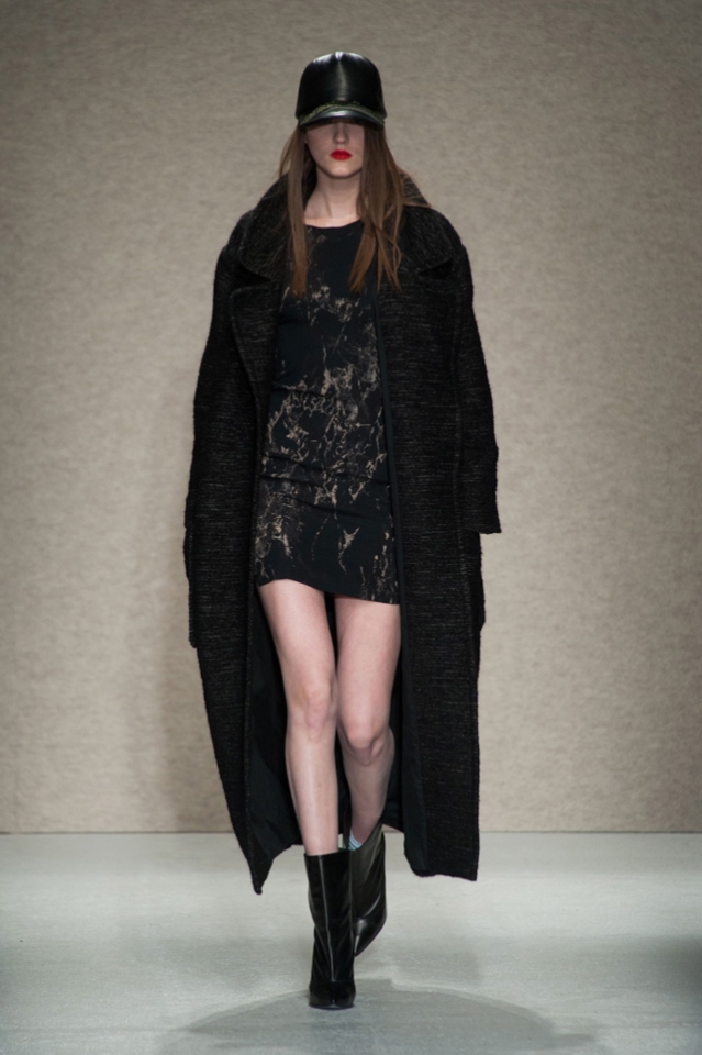 Мини-платье, похожее на небрежно завязанную (на самом деле, тщательно задрапированную) рубашку бойфренда, черный костюм в светло-серую трещинку — на военную униформу (вполне свежий и нетрадиционный взгляд на тему камуфляжа), а широкие брюки оказываются самыми что ни на есть настоящими галифе. Обращения A.F. Vandevorst к милитари-тематике иногда неожиданно буквальны, как в случае летных комбинезонов, и самая первая часть коллекции благородного серого оттенка кажется куда убедительней продолжения.