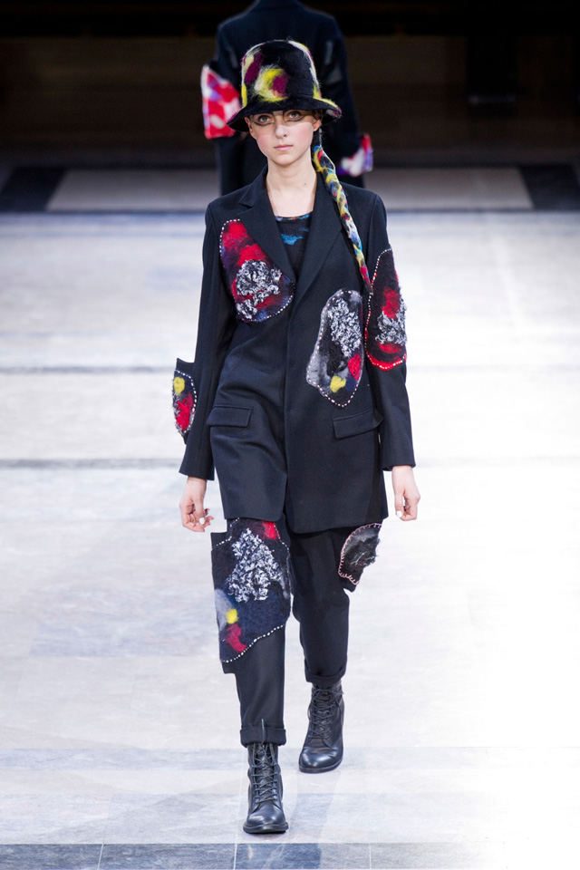 Стендалевское сочетание цветов "красное на черном" никогда не подводит, как, в принципе, редко подводит сочетание черного с каким угодно ярким, насыщенным цветом. Ролан Муре пользуется именно этим приемом, добавляя к своему основному черному и красный, и ультрамарин, и серый с белым, в качестве константы оставляя только черный резкий и угловатый воротничок.